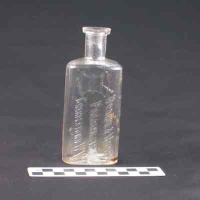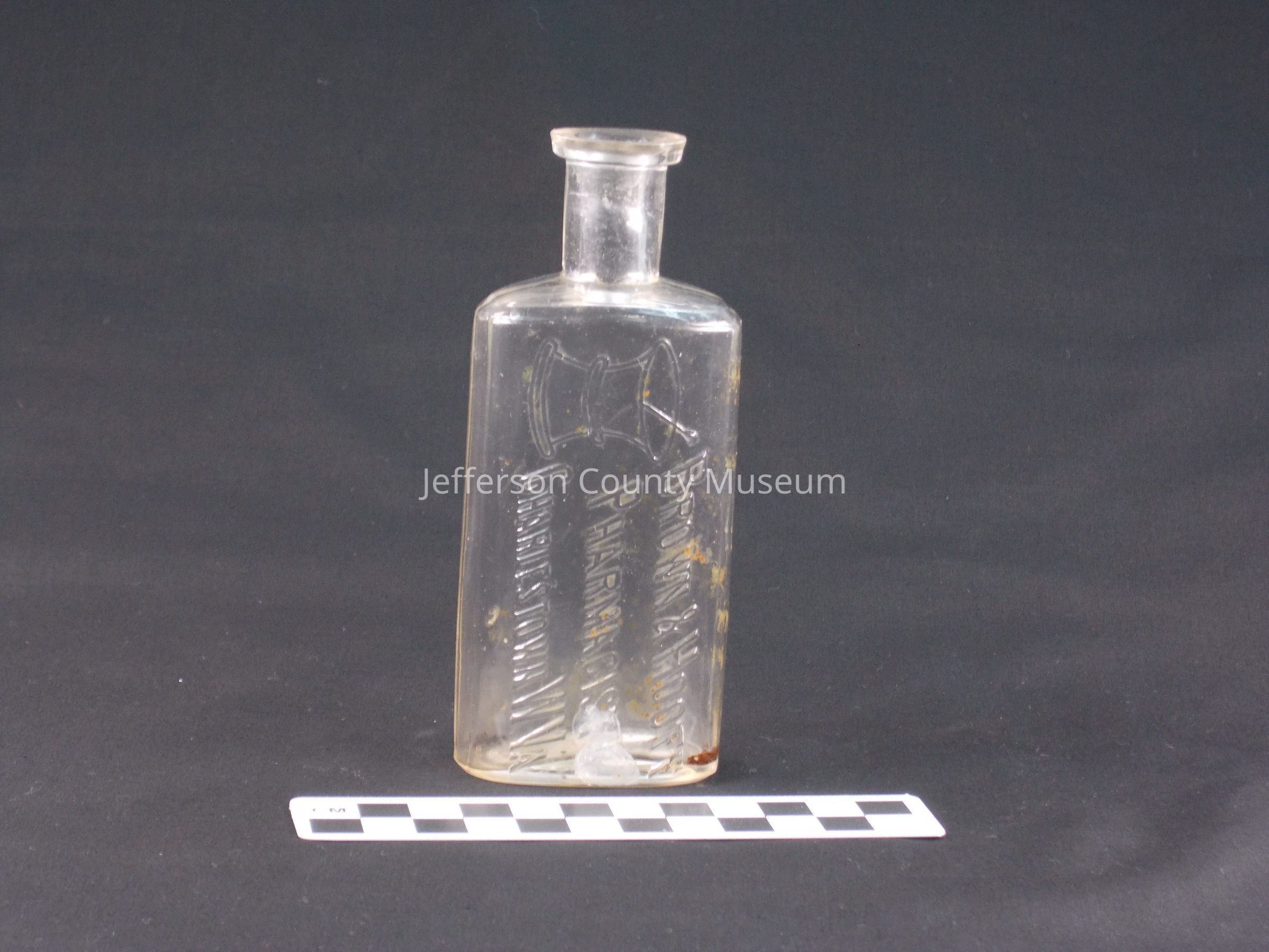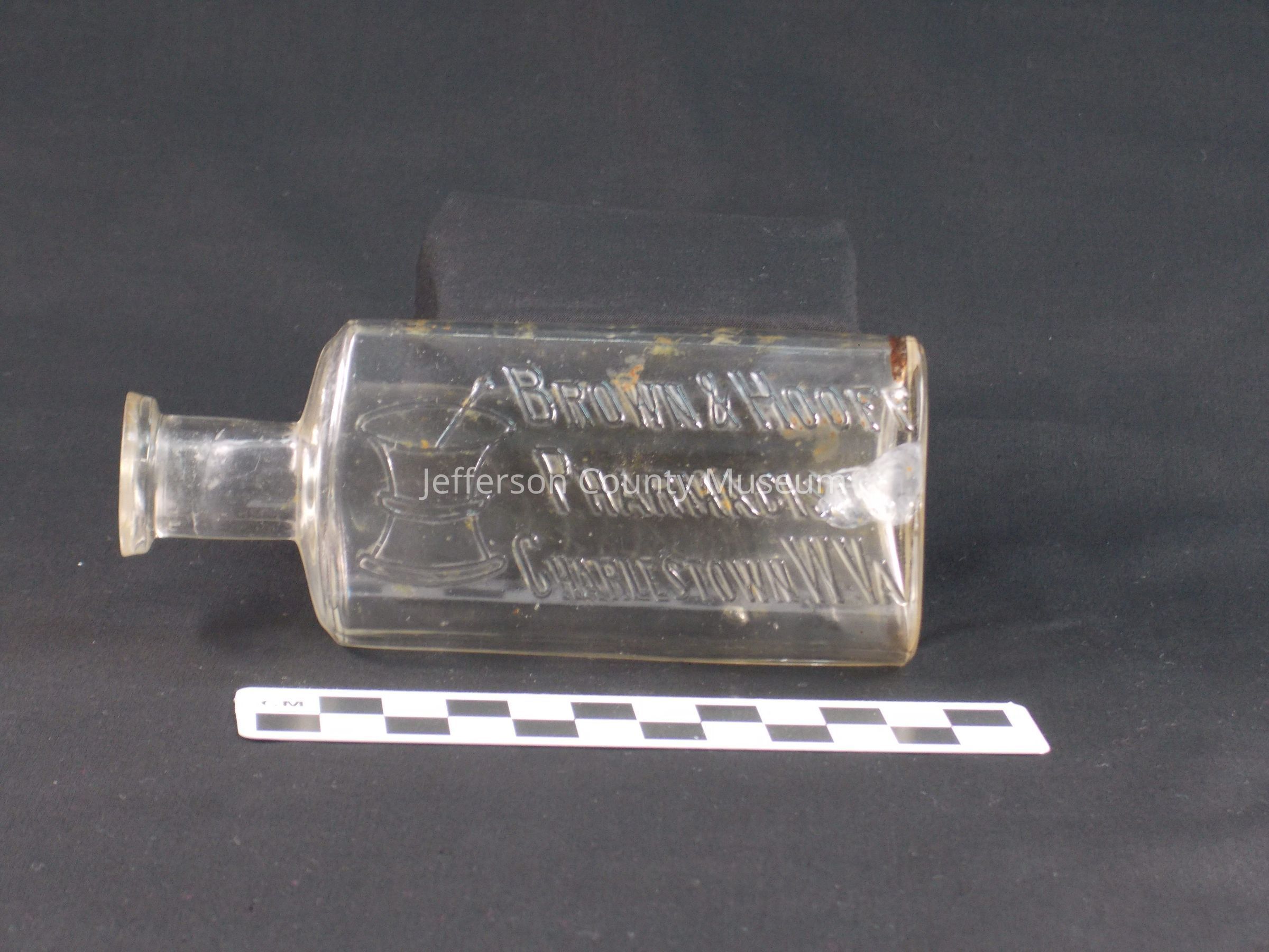 Pharmacy bottle embossed "BROWN & HOOFF PHARMACISTS CHARLESTOWN W.Va.". Mortar and pestle to left of embossing. No top. On bottom "2". "PAT'D. 6/25/89 C& C CO."Acquisition