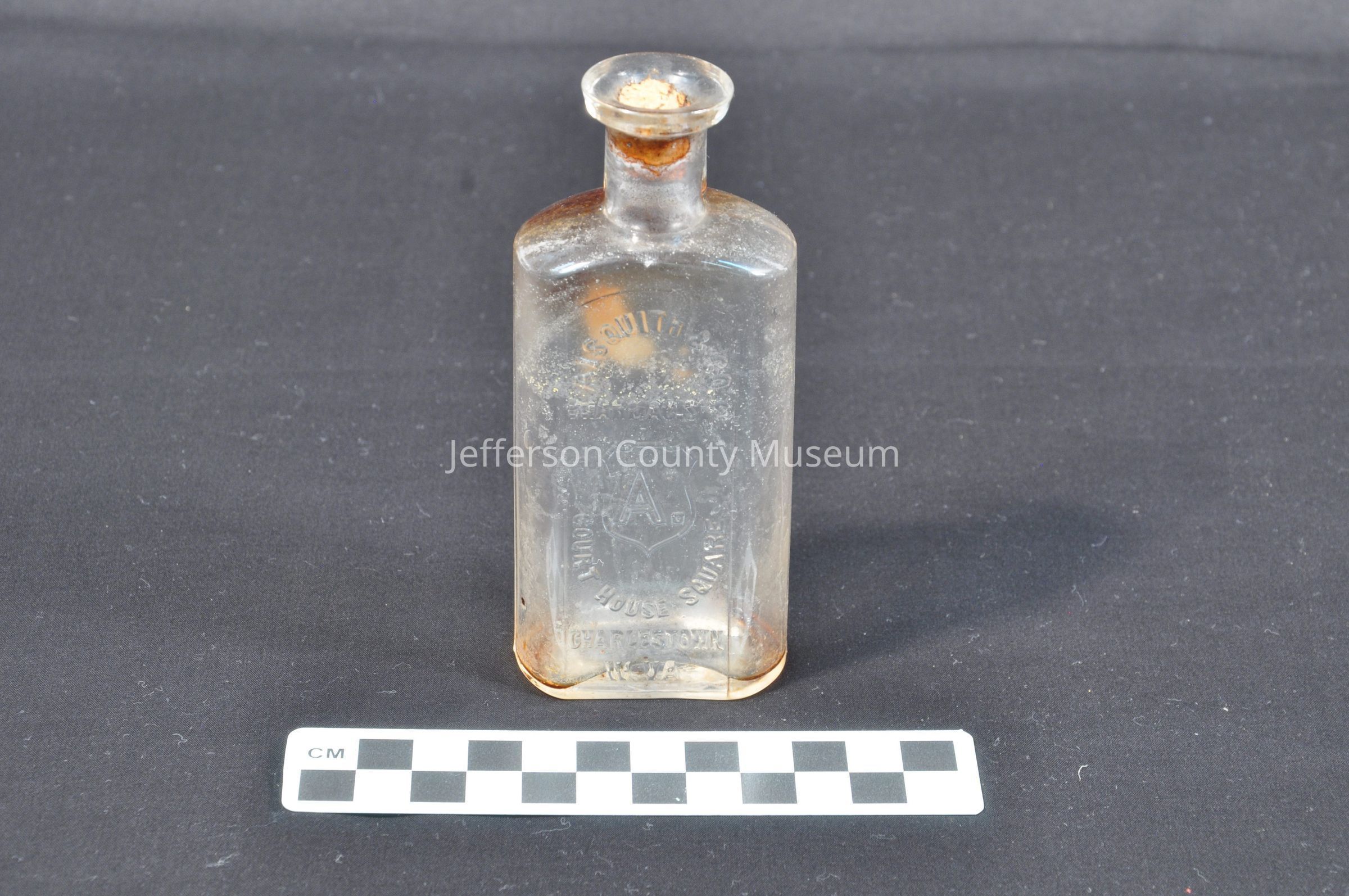 Clear glass pharmacy bottle embossed "ASQUITH & CO. PHARMACISTS court house SQUARE CHARLESTOWN W.VA." "A" in shield. Cork in bottle.Acquisition