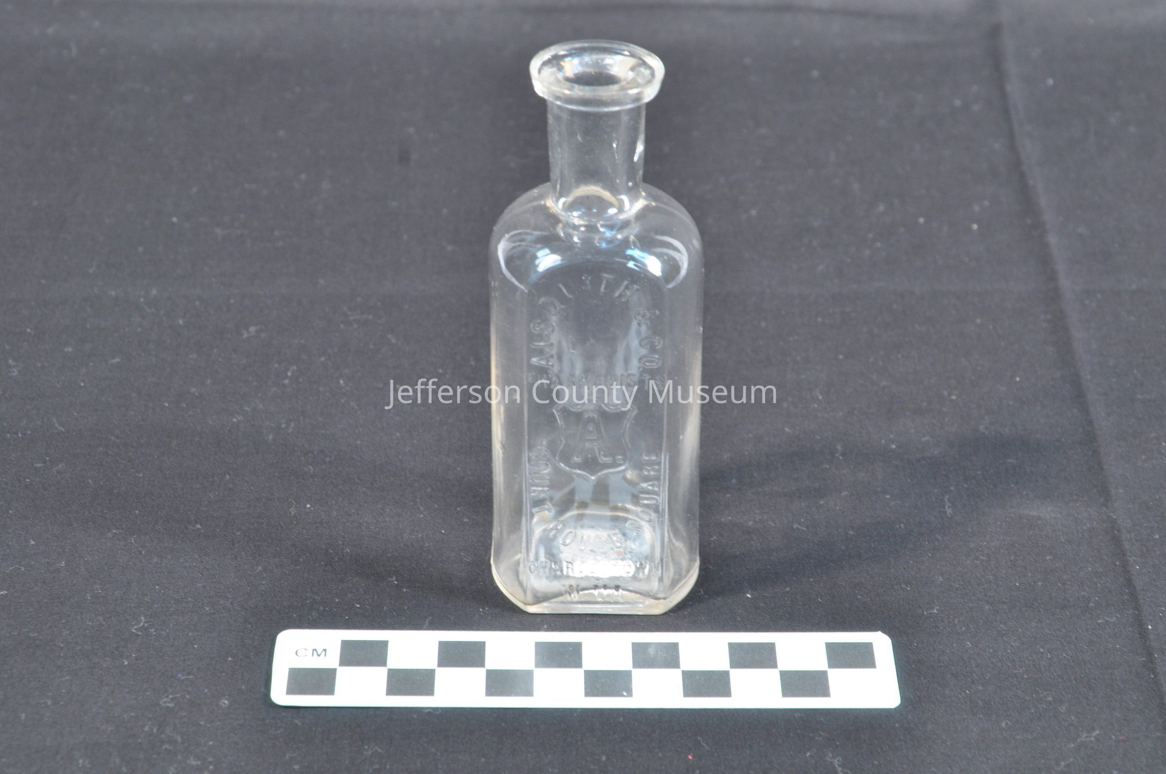 Clear glass pharmacy bottle, no cap, embossed "ASQUITH & CO. PHARMACISTS court house SQUARE CHARLESTOWN W.VA." "A" in shield. On bottom "W.T. & Co. PAT. JAN.22, 78 H-U.S.A.".Acquisition