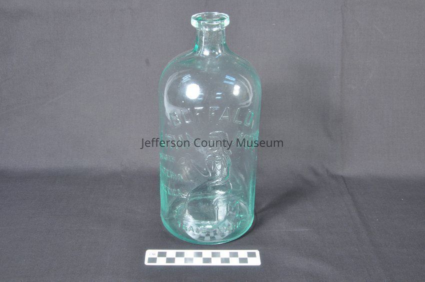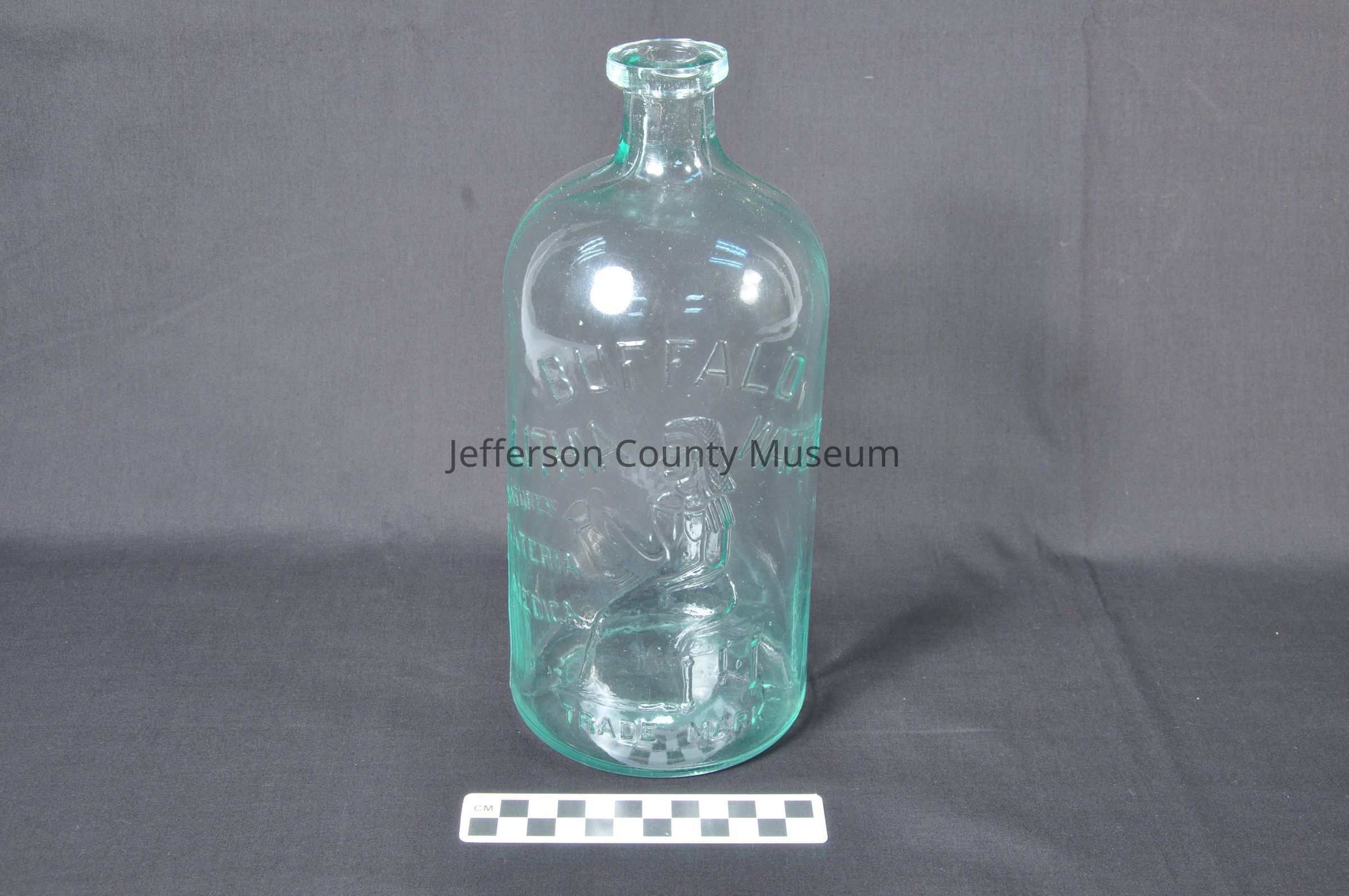 Clear blue-green glass water bottle. Embossed on one side "BUFFALO LITHIA WATER NATURES MATERIA MEDICA TRADE MARK". Woman in robe sitting on bench holding a pitcher.Acquisition