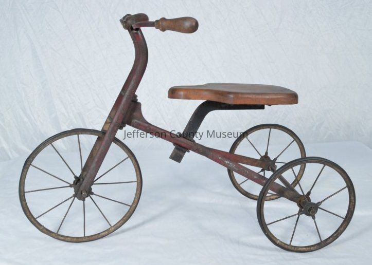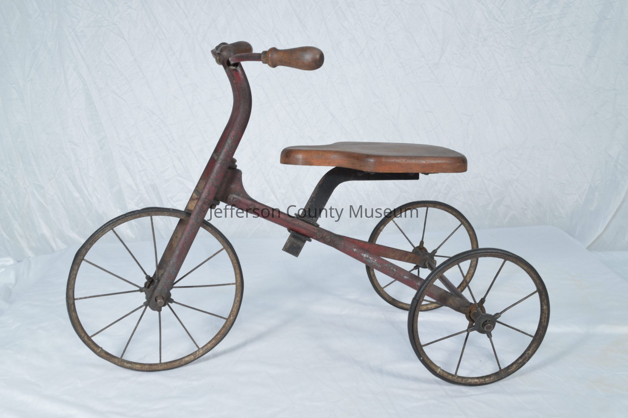 Wood and iron tricycle, wood handles and seat, no pedals. Wheels have rubber around rim to help it ride smoother.Acquisition