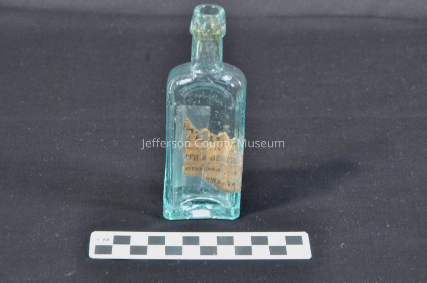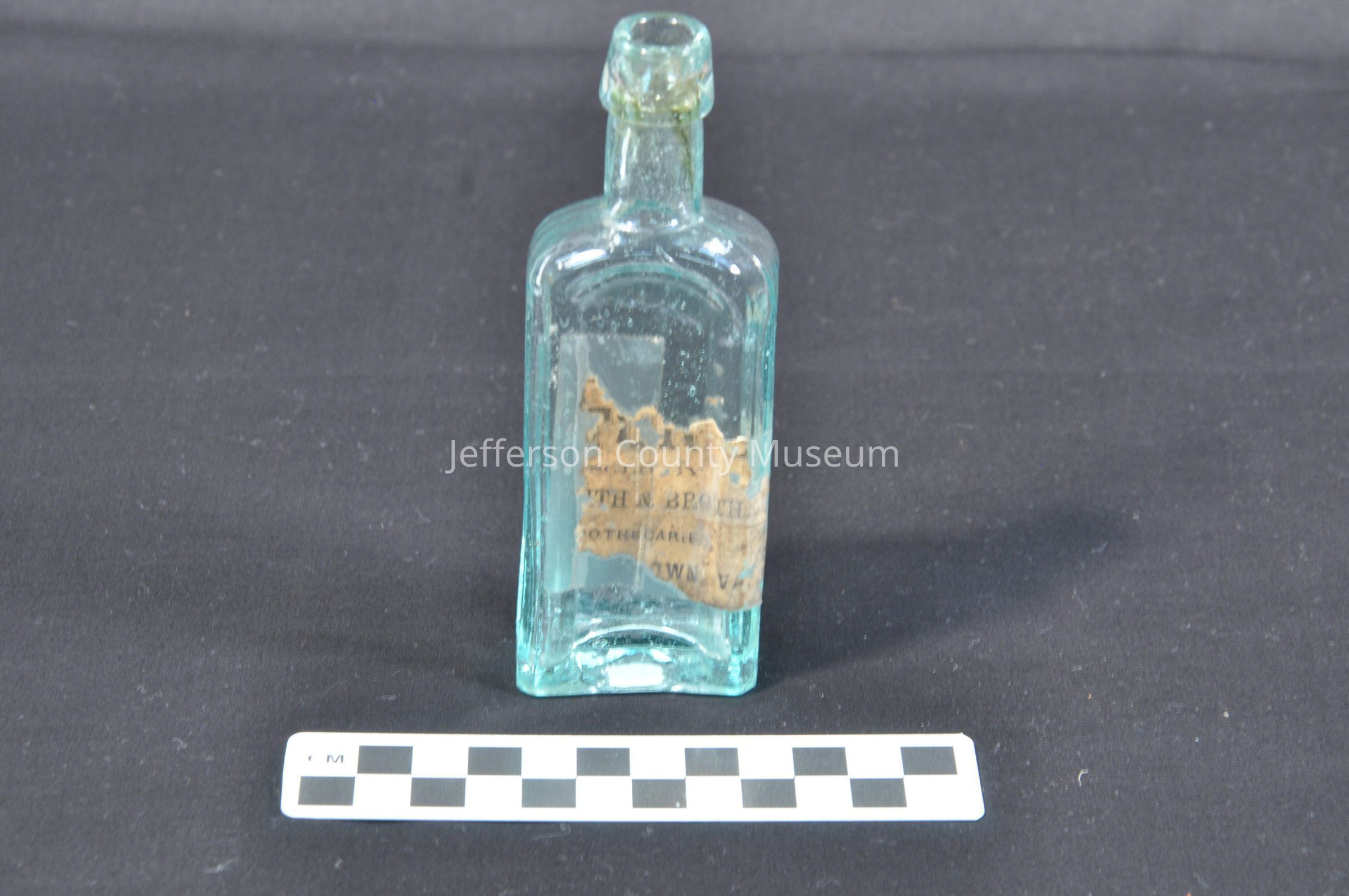 Clear glass blue-green pharmacy bottle, no cap. Fragment of label "----- & Broth-- --othecaries,---------own, Va."Acquisition
