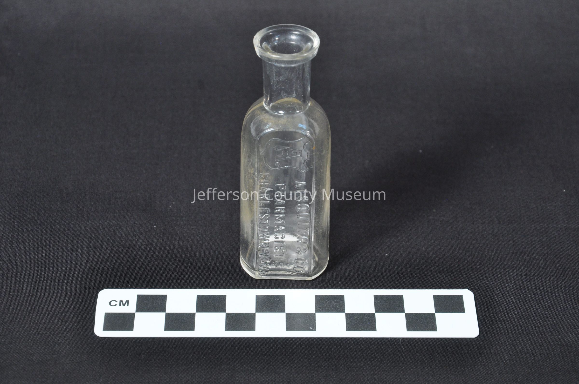 Clear glass pharmacy bottle. Flat on one side. Remainder round. Embossed with "A" in shield. "AISQUITH & CO. PHARMACISTS CHARLESTOWN, W.VA." On bottom "W. T. & Co. PAT. JAN. 22, 78. G".Acquisition