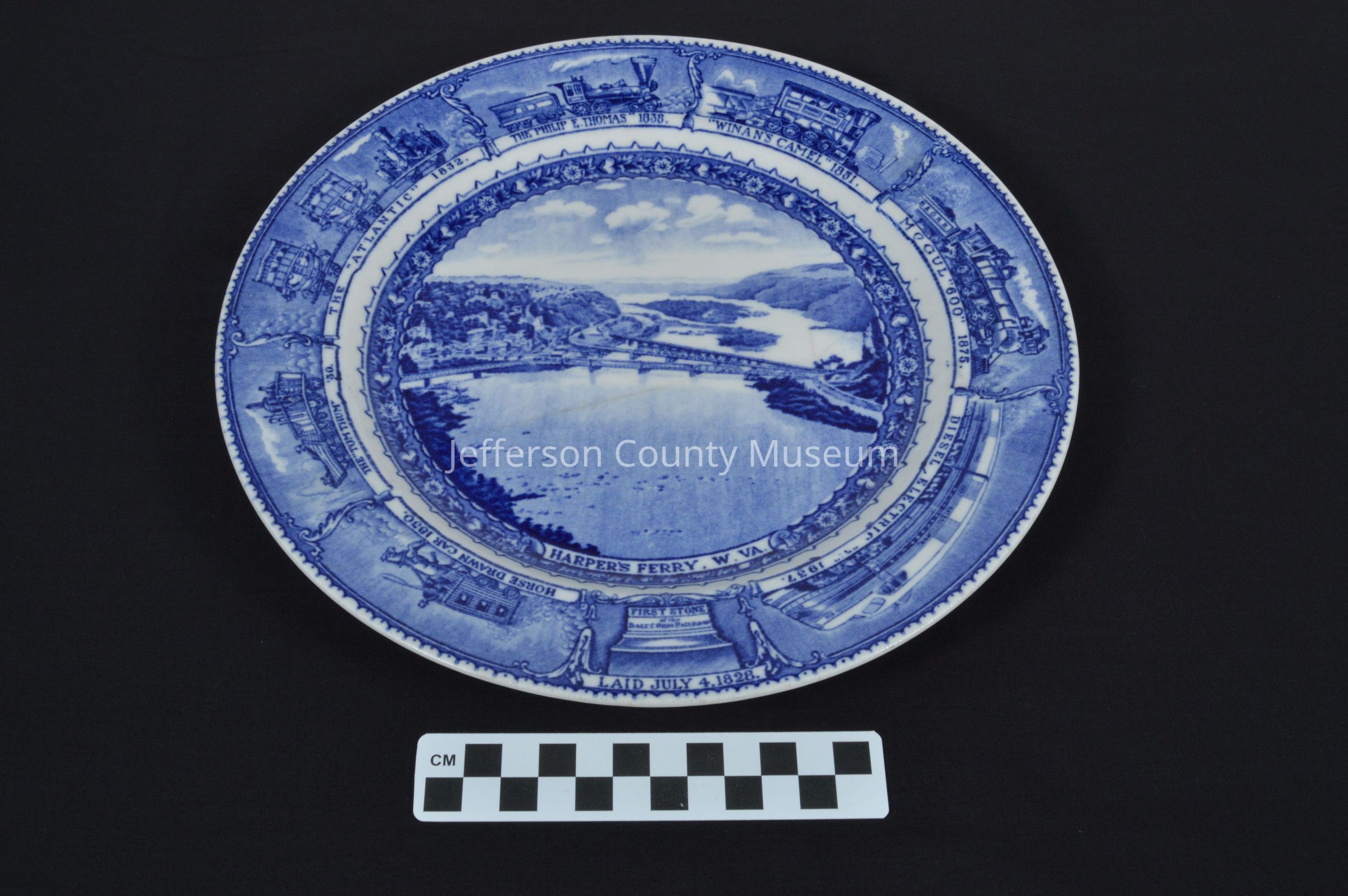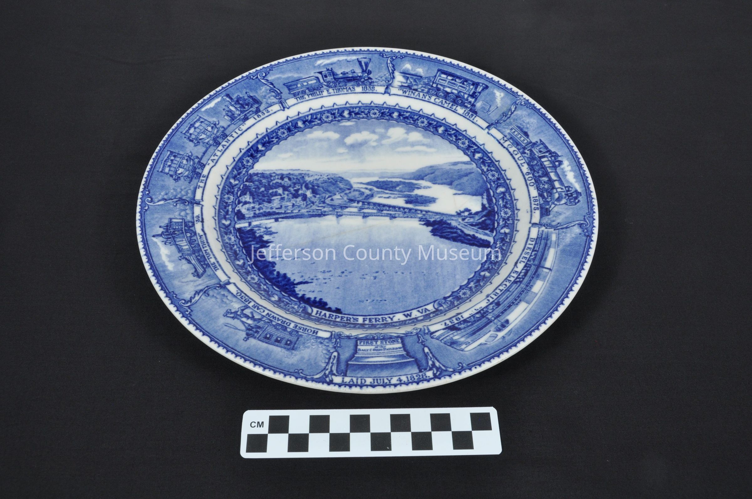 Blue and white china. Scene of Harpers Ferry bridges. At bottom of scene "HARPER'S FERRY, W. VA.". Around edge of plate are depictions of engines from earliest horsedrawn car in 1830 to diesel electric engine of 1937. Marked on back with U.S. Capitol dome and "1827-1927 BALTIMORE AND OHIO RAILROAD Scammell's LAMBERTON CHINA DESIGN PATENTED".Acquisition