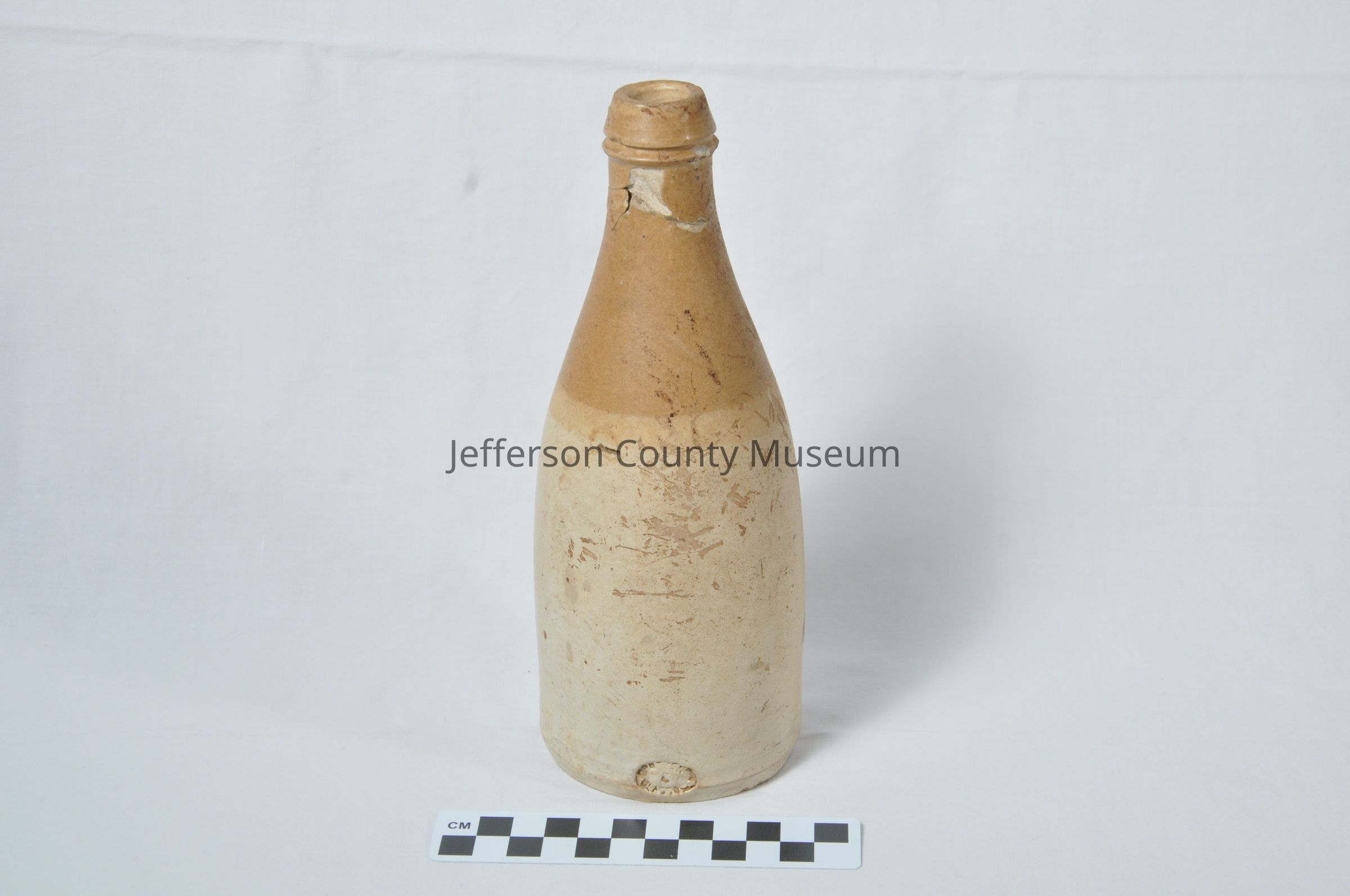 Civil War era stoneware bottle. Light tan on bottom two thirds. Top part is darker tan. Oval impression at bottom has illegible words around top half with "GLASGOW" below.Acquisition