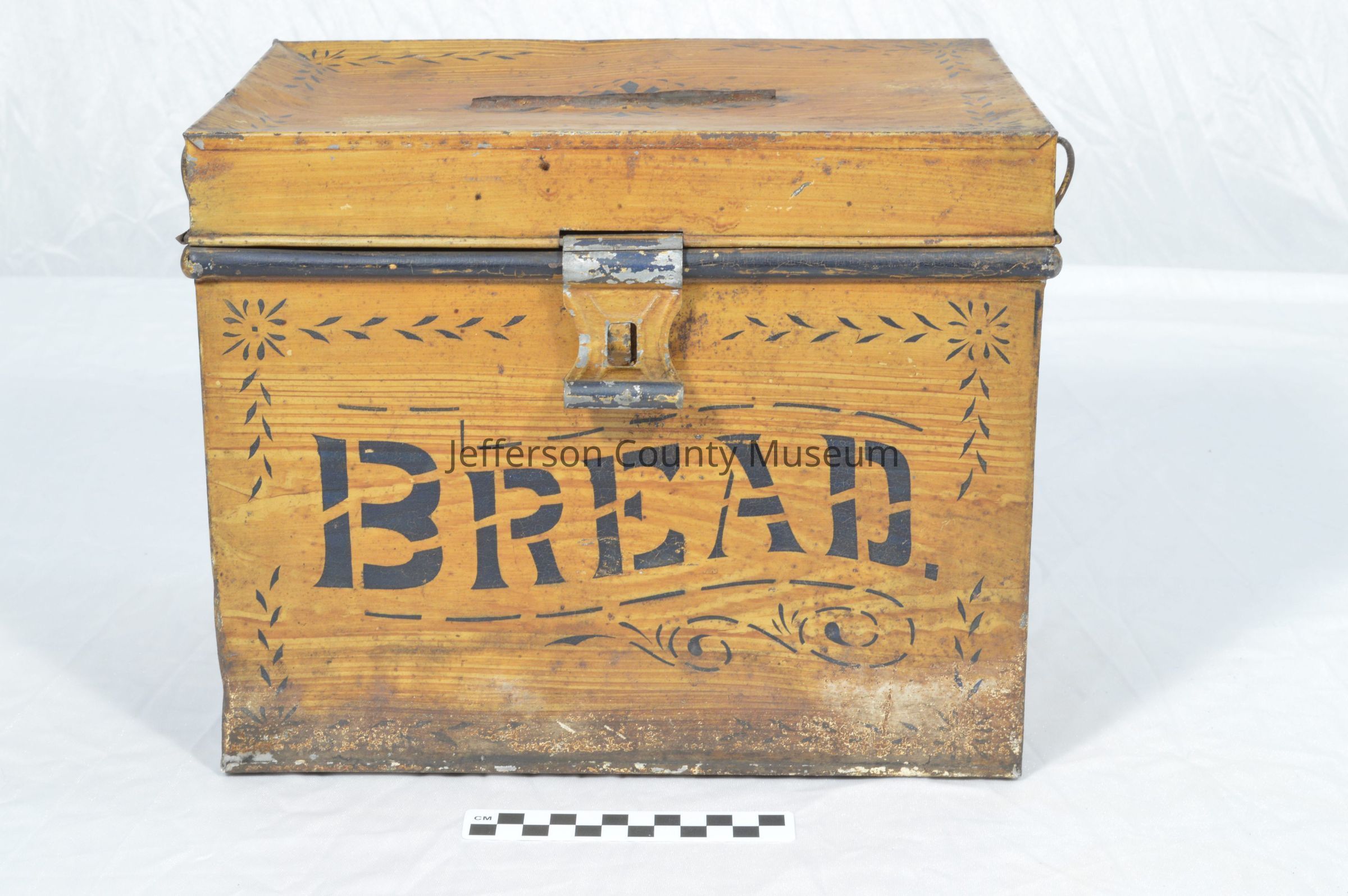 Tin box, mid 19th century. Painted yellow to simulate wood graining. Black stencil decoration with "BREAD" on front. Thin tin handles at each side. Large hand-made slit in lid.Acquisition