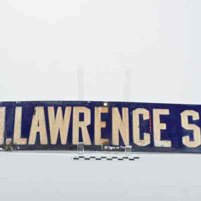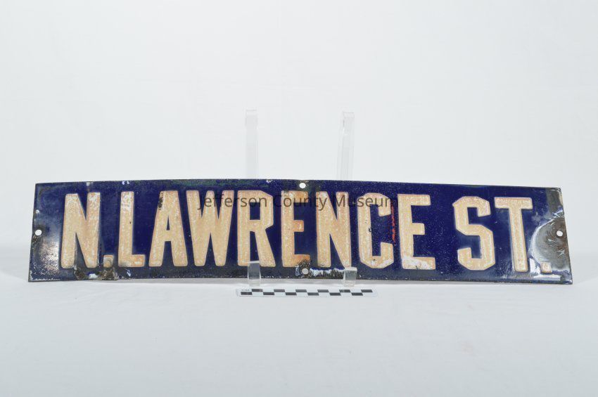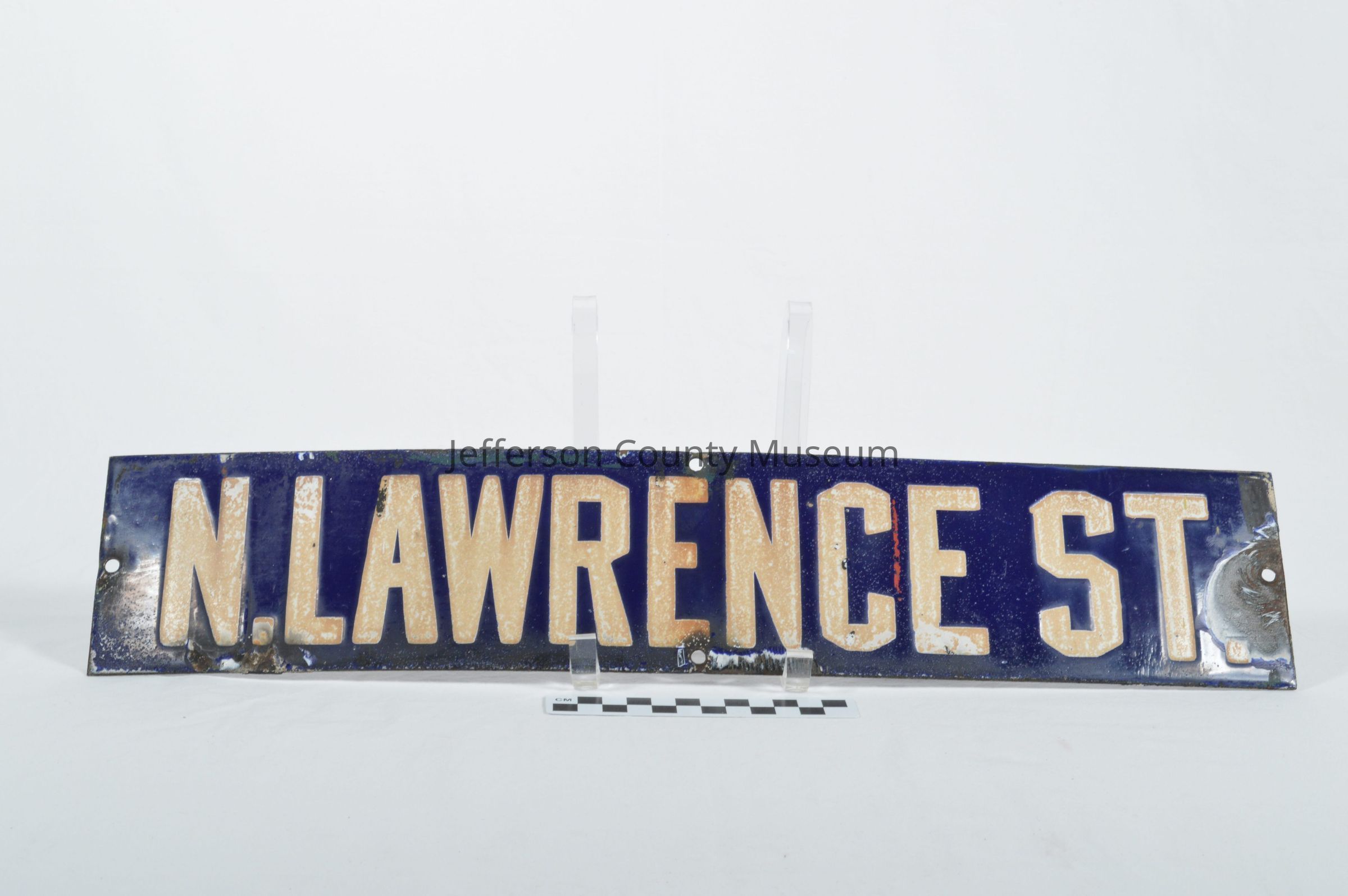White letters on blue porcelain background "N. LAWRENCE ST.". Holes for screws or bolts on right, left and at center top and bottom.Acquisition