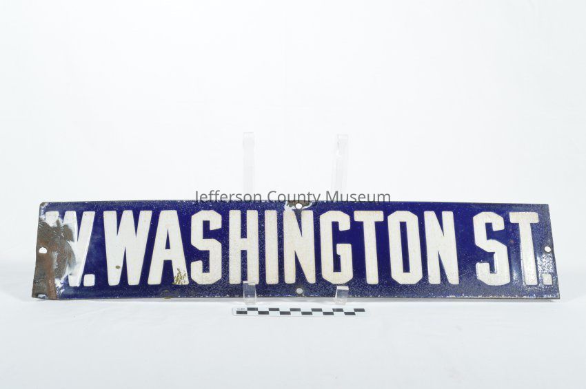White letters on blue porcelain background "W. WASHINGTON ST.". Holes for screws or bolts on right, left and at center top and bottom.Acquisition