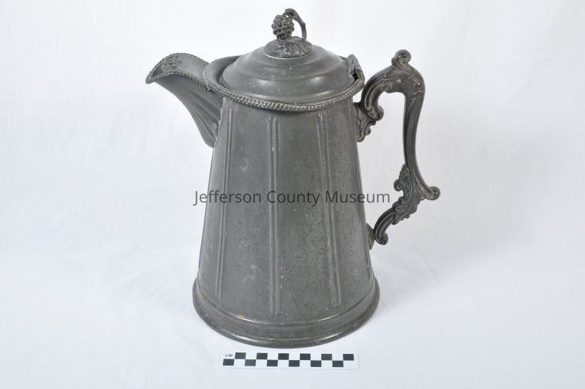 Large pewter water pitcher with berry finial on lid which is hinged. Marked on bottom "MERIDEN BRIT'A CO. DOUBLE WALL PITCHER LYMAN'S PATENT JUNE 8, 1858".Acquisition