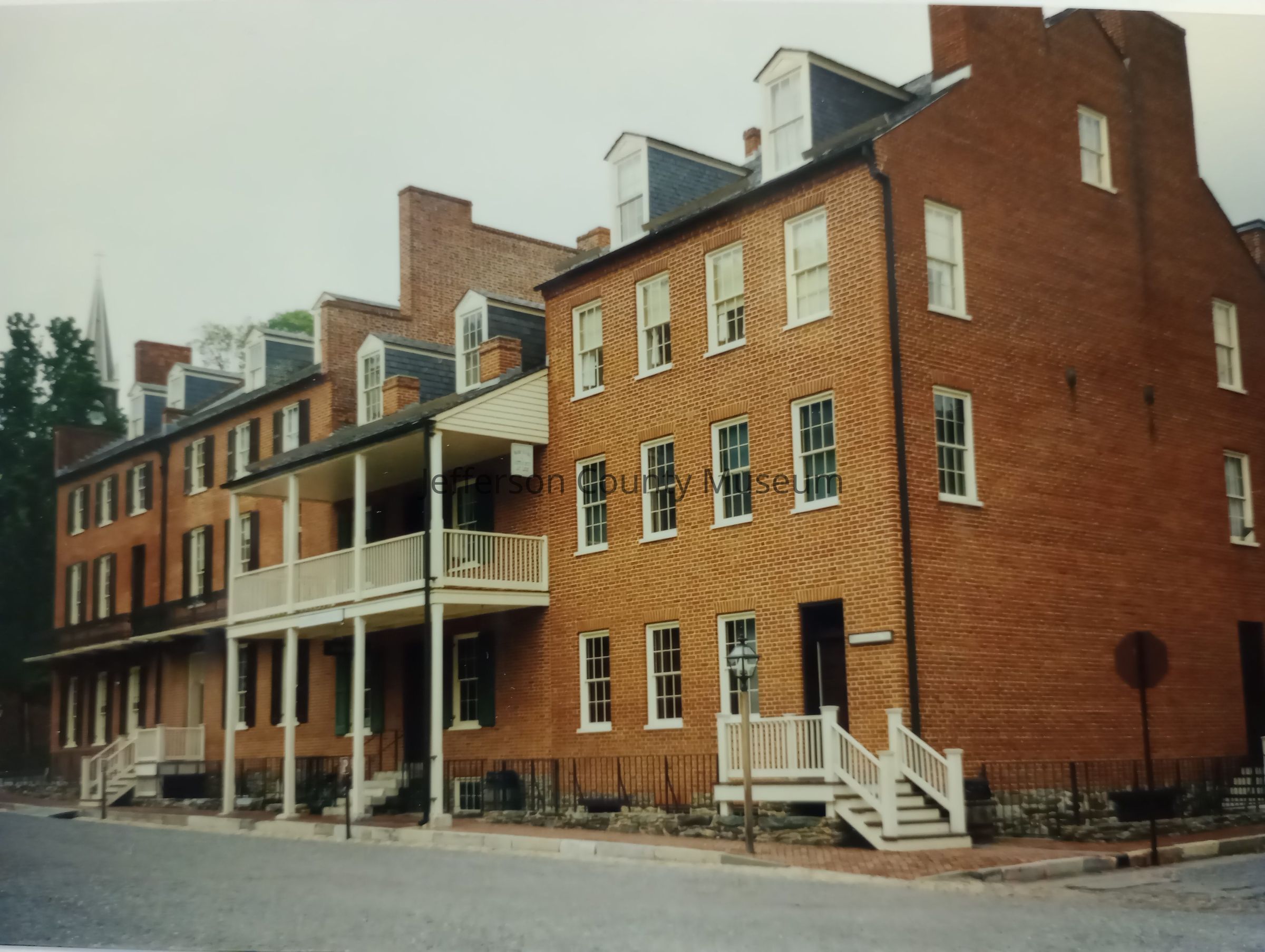 Color photograph of the block of Shenandoah street nearest the Potomac River, including the John Brown exhibit building. Steeple of St. Peter's Church is visible in the background.Photograph Details