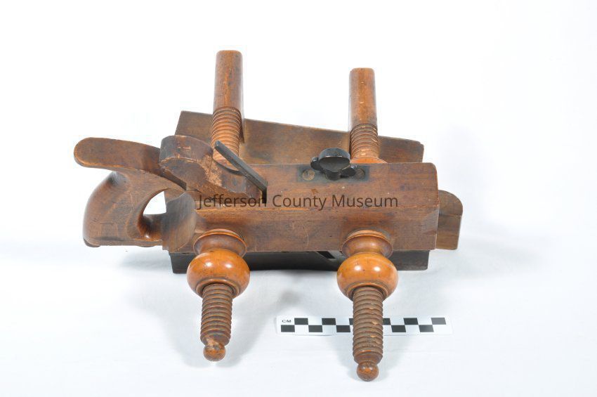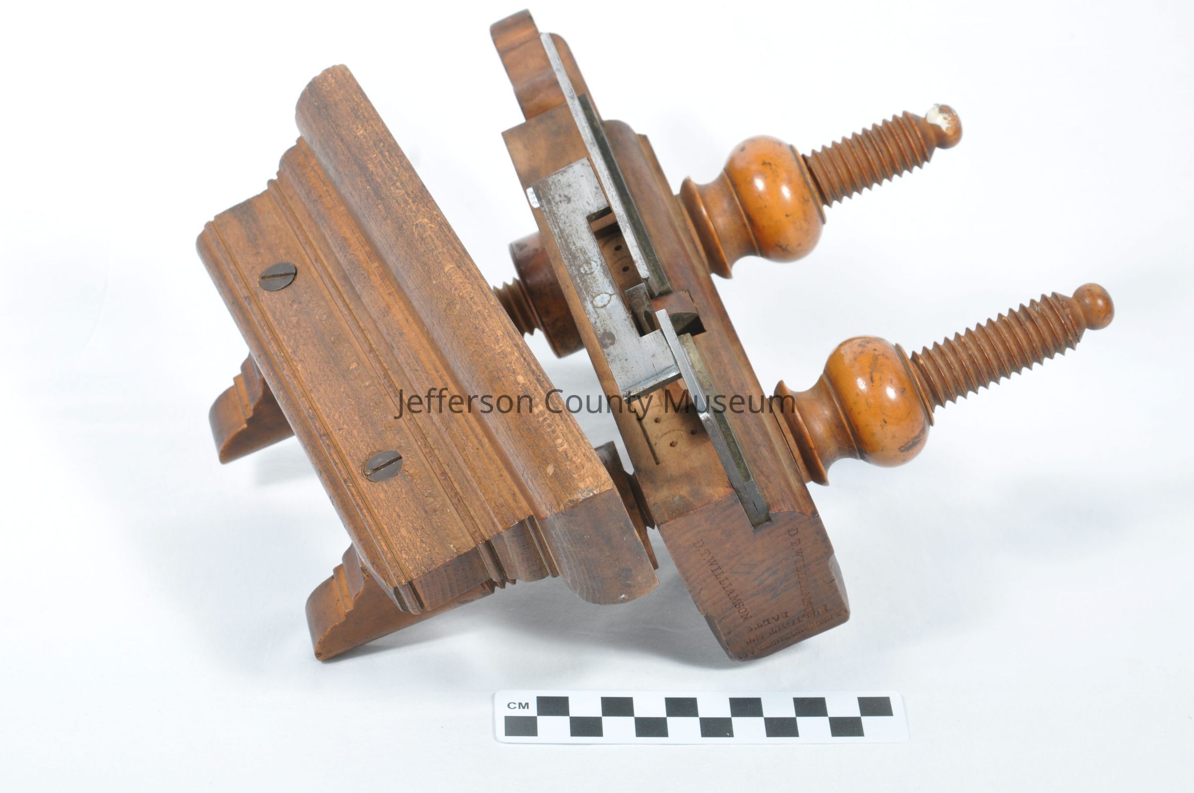 Molding plane used for trim. Brown wood and metal. Thin blade. Has two wood posts which are placed through the body of the plane. These posts have threads and wood turn screws with a block on the side to make it adjustable for different sizes of wood. Stamped in two places on top and end "D. T. WILLIAMSON". Alson on one end "A. B. SEIDENSTRICKER & CO. 37 LIGHT ST. BALTO".Acquisition