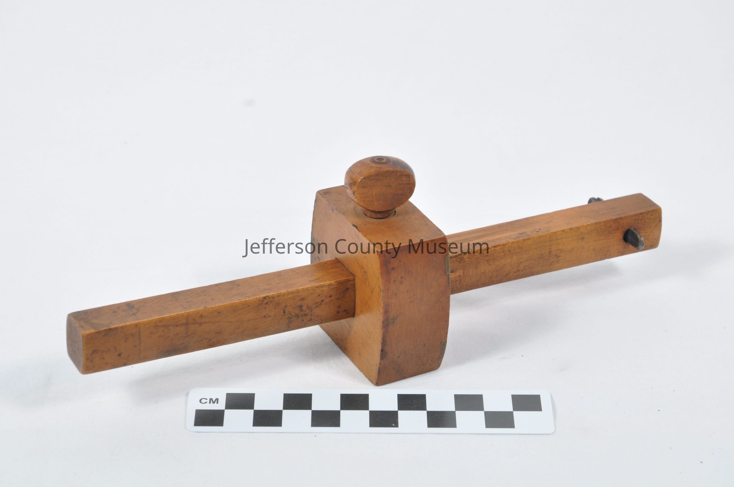 Wood and metal scriber. Has pin through one end with sharp blade on bottom for marking wood to be cut. Also has small, moveable block with wood screw to adjust to different sizes of wood. Wood block has thin brass plates . Stamped on side of block "DISSTON & MORSS PHILADA WARRANTED".Acquisition