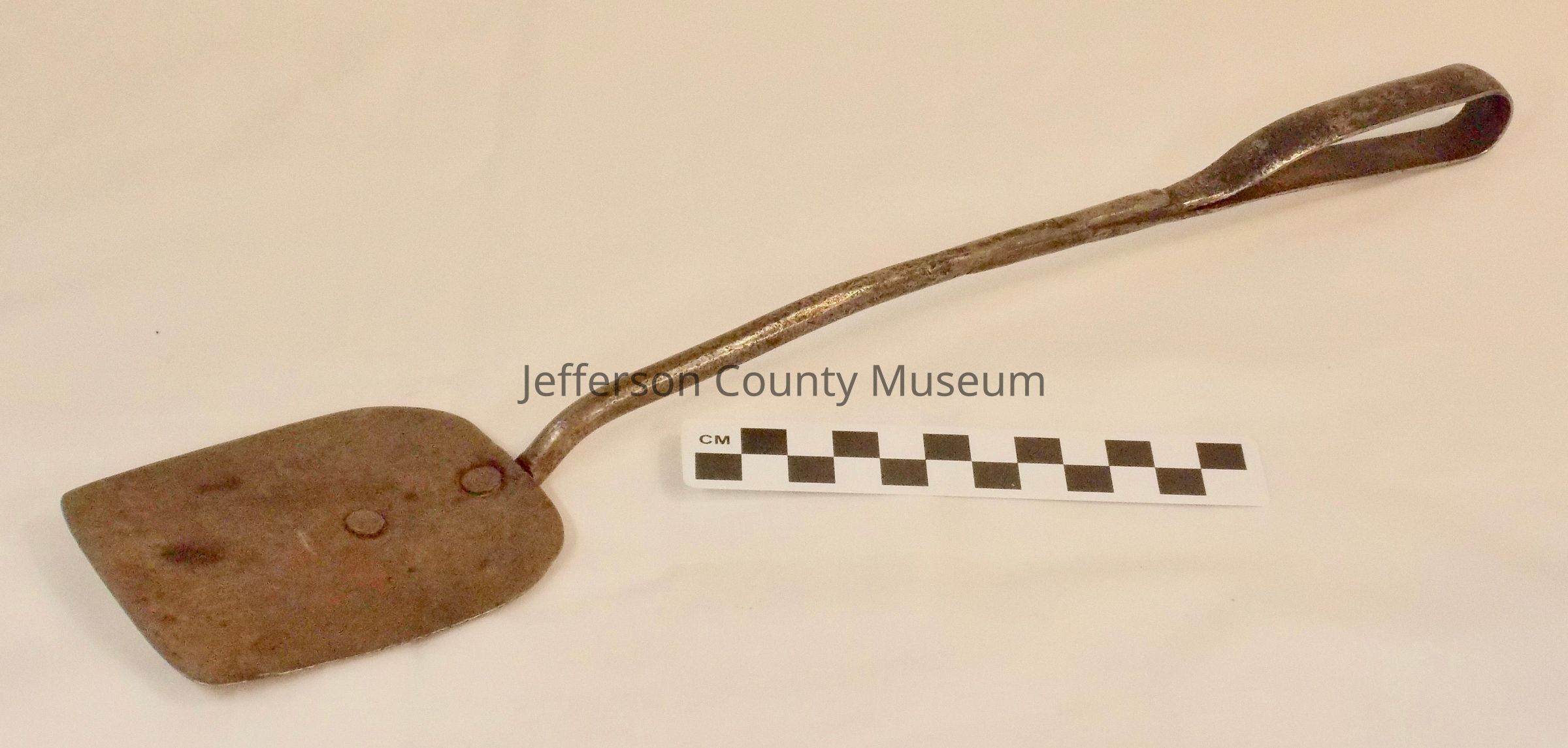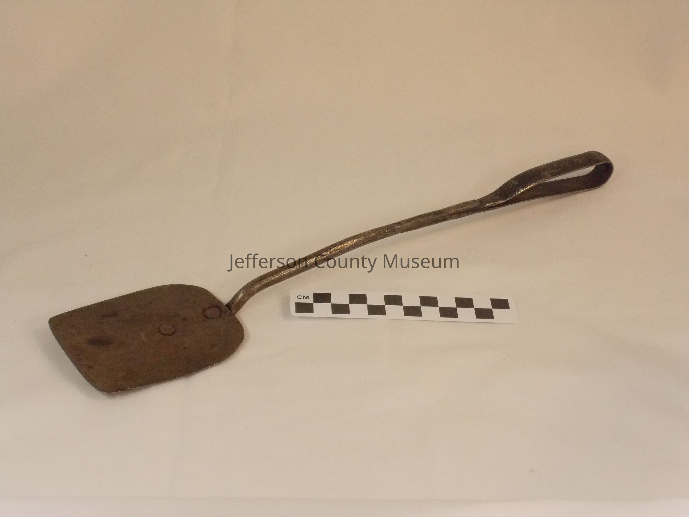 Hand wrought iron spatula. Handle flattened and folded back on itself to form an opening so spatula could be hung.Acquisition