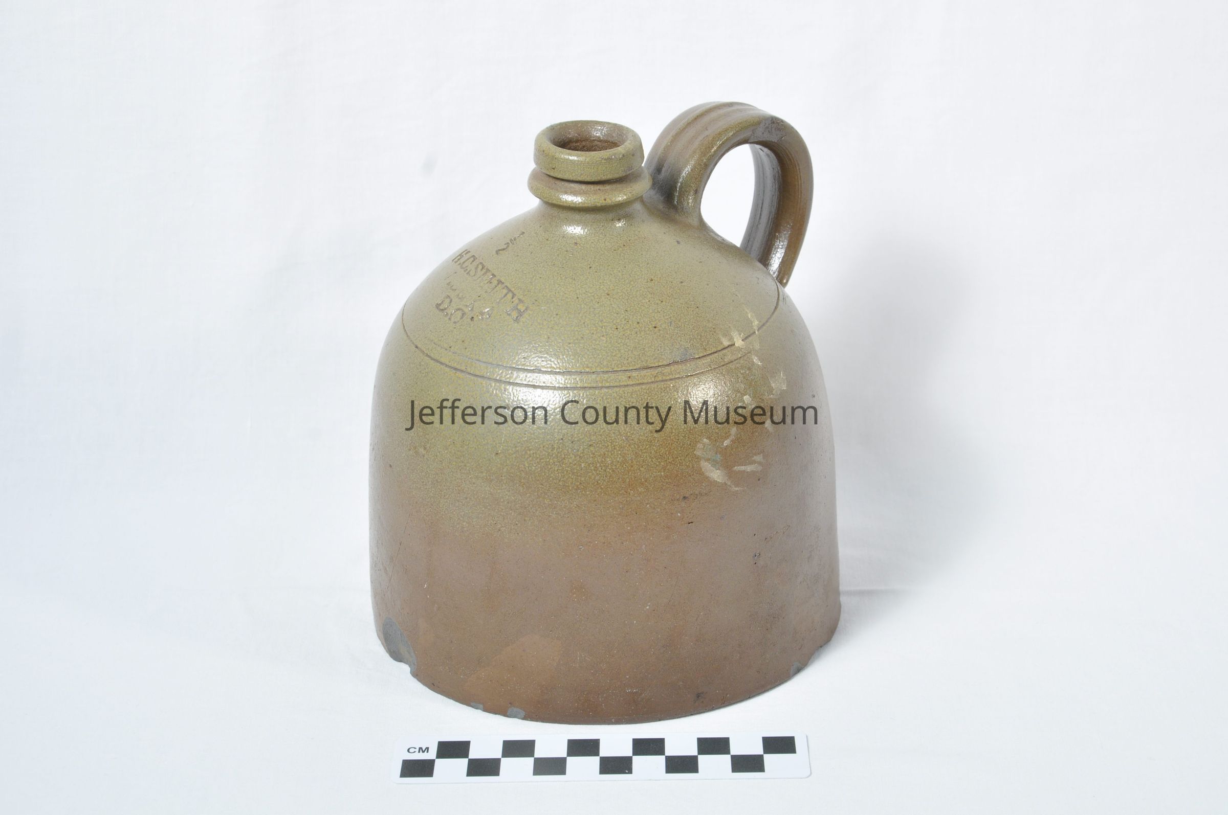 Salt-glazed stoneware jug. Dark brown at bottom to light green-brown at top. Ring shaped handle. Marked "1/2 H.C. SMITH ALEXA D.C.".Acquisition