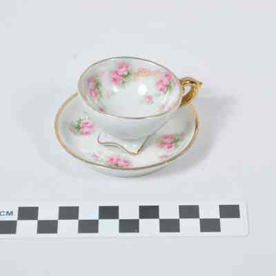 Tea cup with saucer. Pink rose design with gold trim.