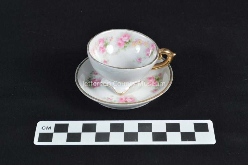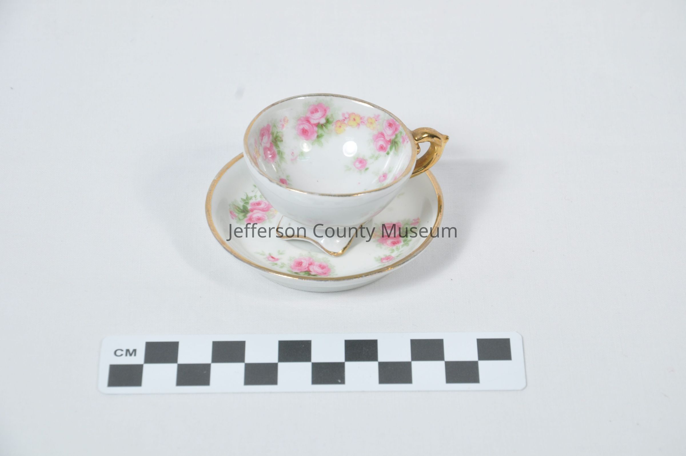 Tea cup (a) with saucer (b). Pink rose design with gold trim.