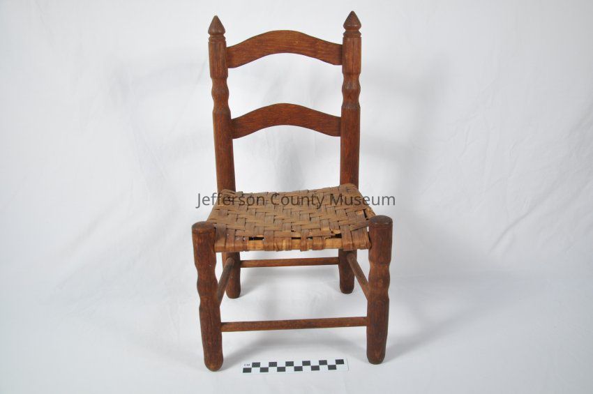 Wooden doll chair. Seat woven with wood strips. Pointed finials at top of back legs.