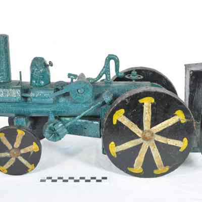 Threshing machine toy, crudely built mostly of wood with some metal parts and pieces. Large rear wheels painted black with yellow spokes, smaller front wheels. Machine is painted green overall except wheels and an attachment on back with two square black vertical pieces.Acquisition