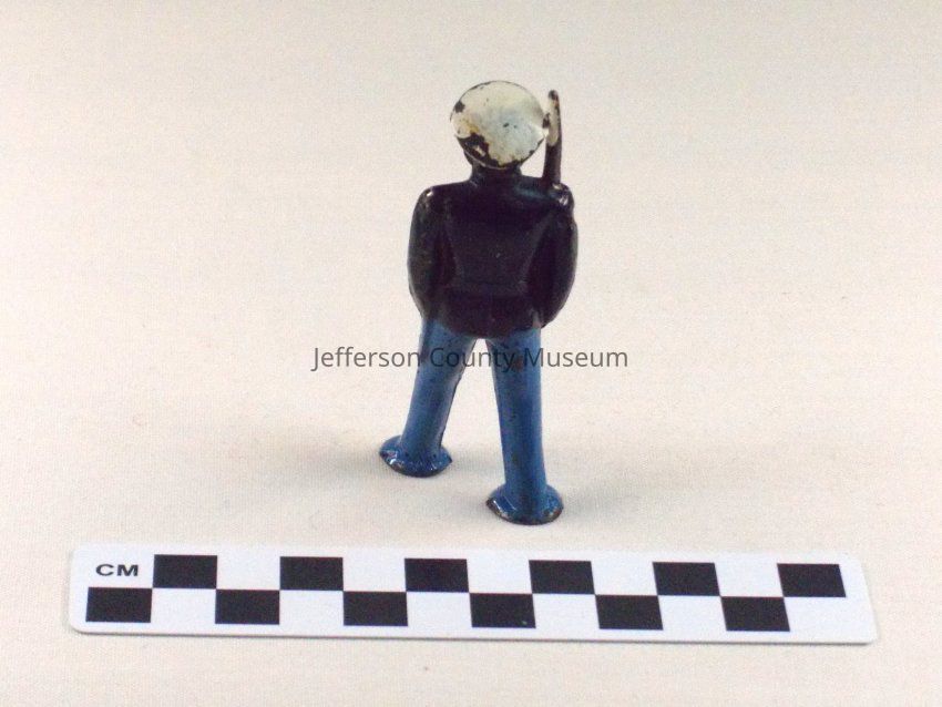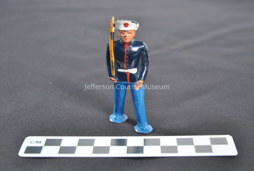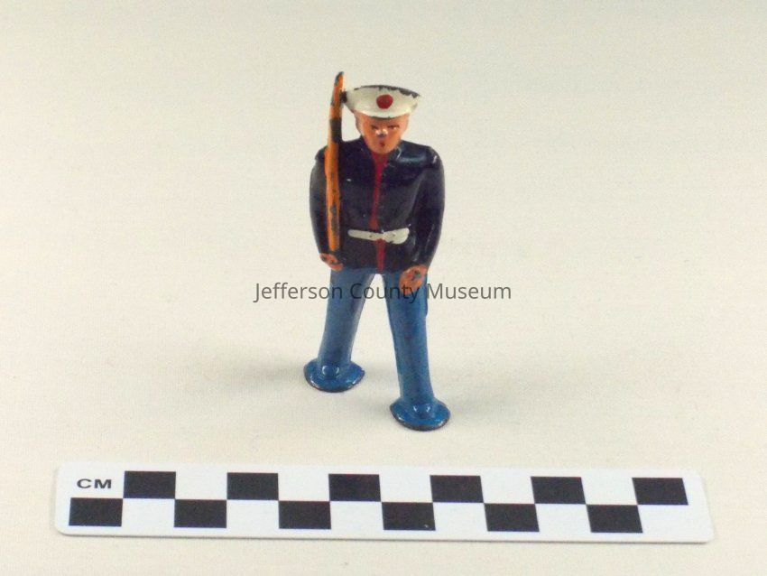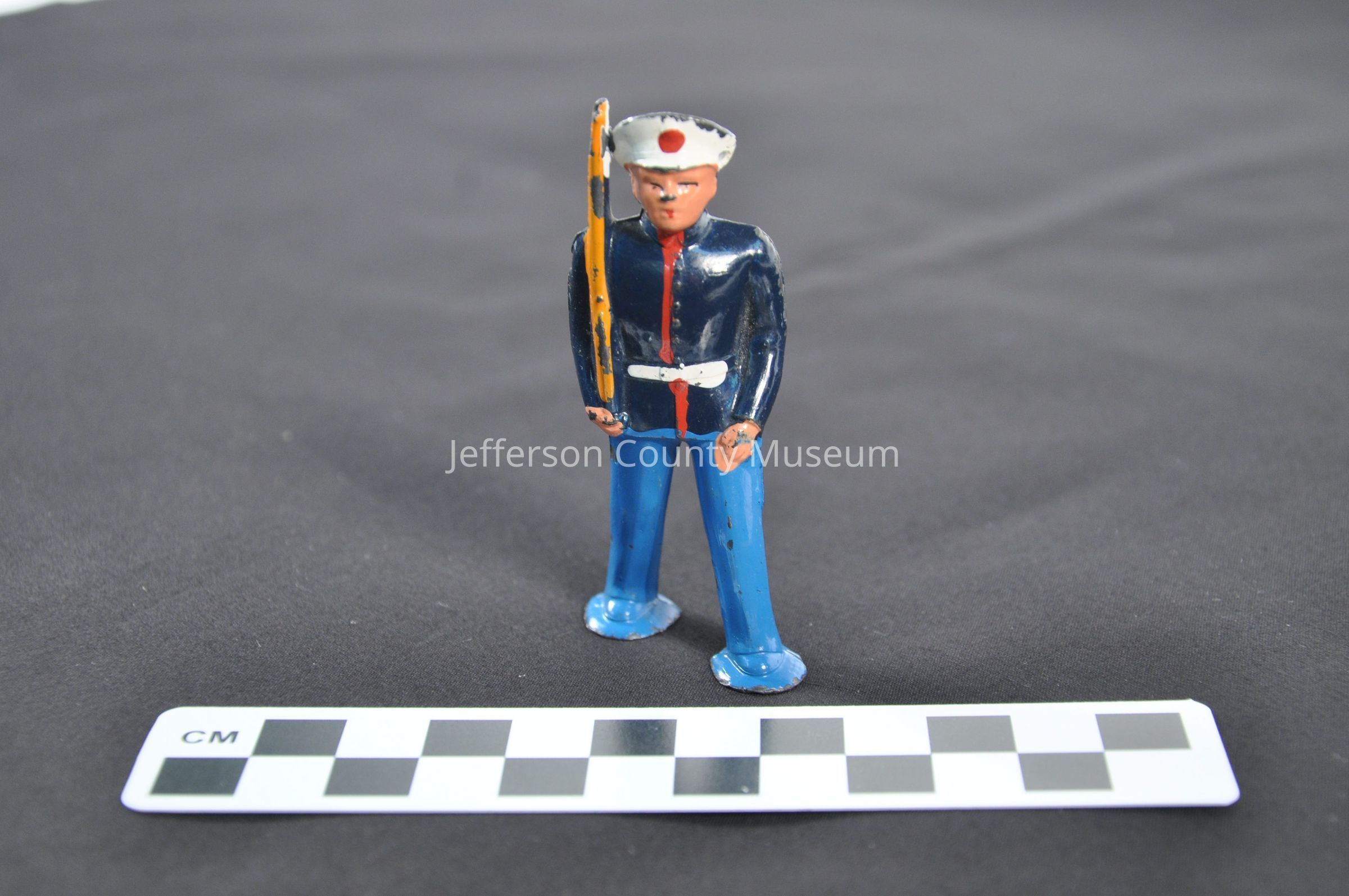 Metal toy Marine in full dress uniform carrying a rifle on his right shoulder. Rifle is painted light orange.Acquisition