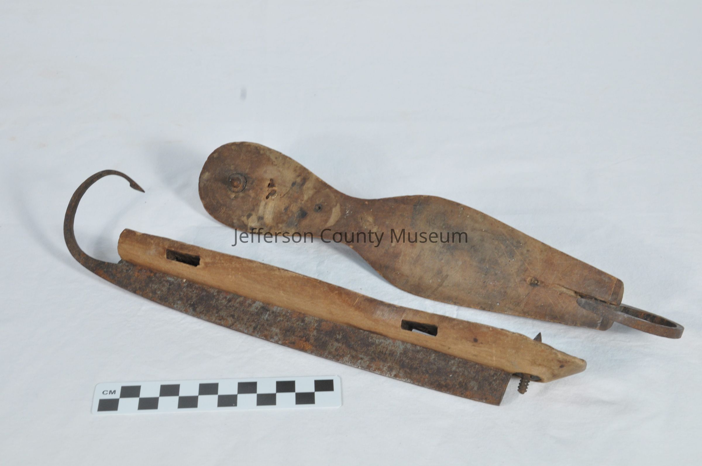 Wood and metal ice skates. Small spike at heel for holding to shoe. No straps. Blade is formed into a decorative curl at toe.Acquisition