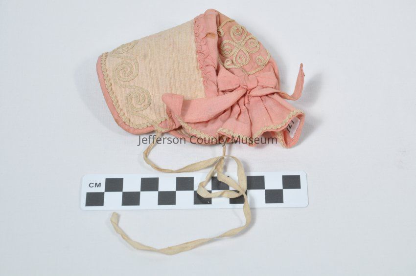 Light and dark pink bonnet for doll. Bow in back. White ribbons for tying to head.Acquisition