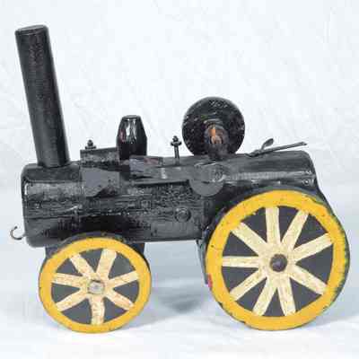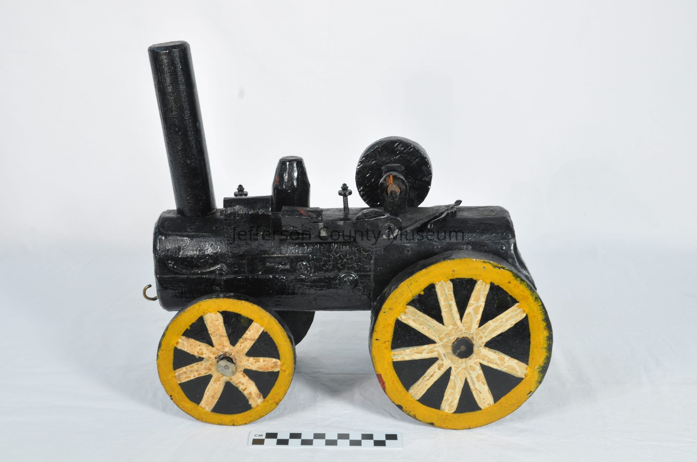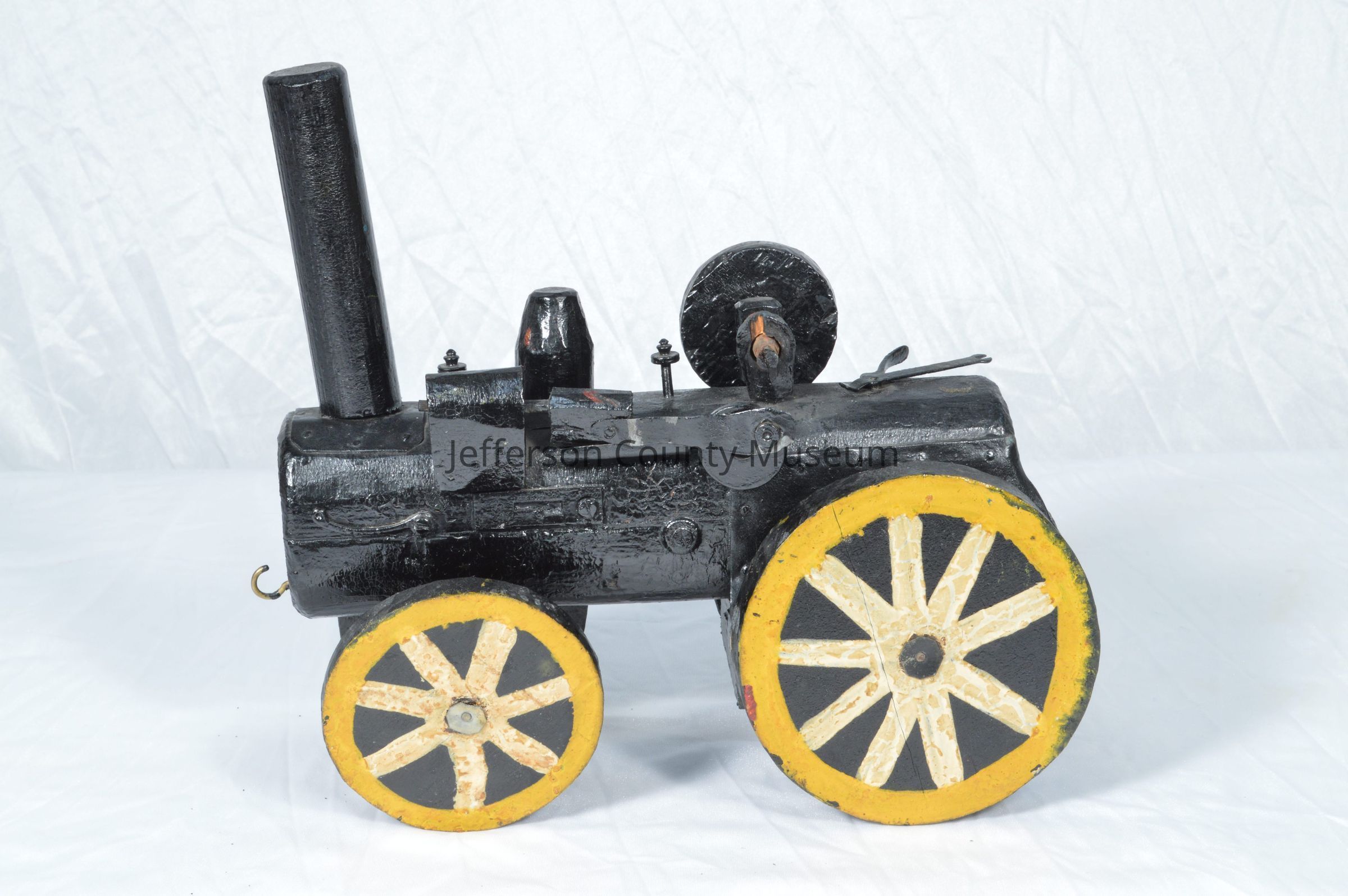 Crudely made wooden train engine painted black. Tall stack. Wheels are black with white spokes and yellow rims. Brass hook screwed into front for pulling. Ring attached to back.Acquisition