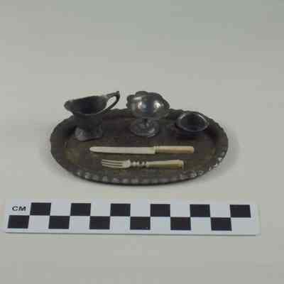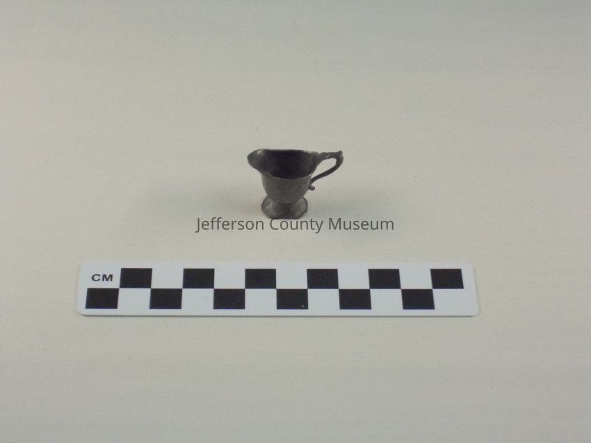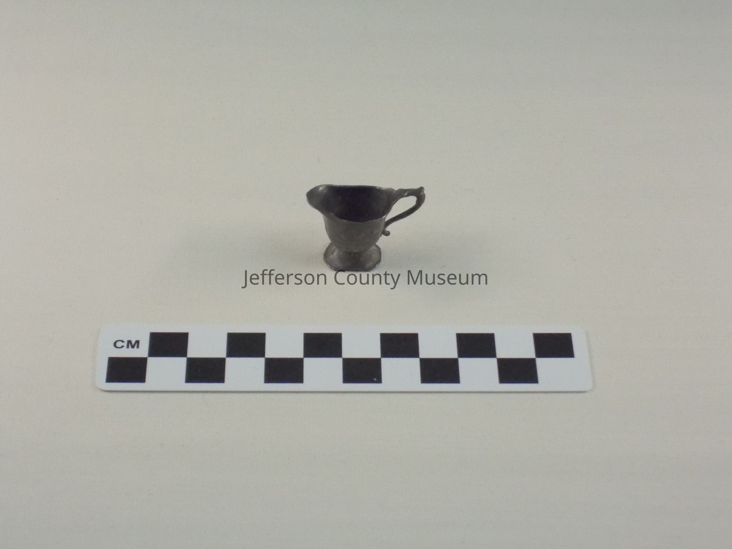 Pewter water pitcher with floral decoration. Belonged to Ellen Carter Hooff.