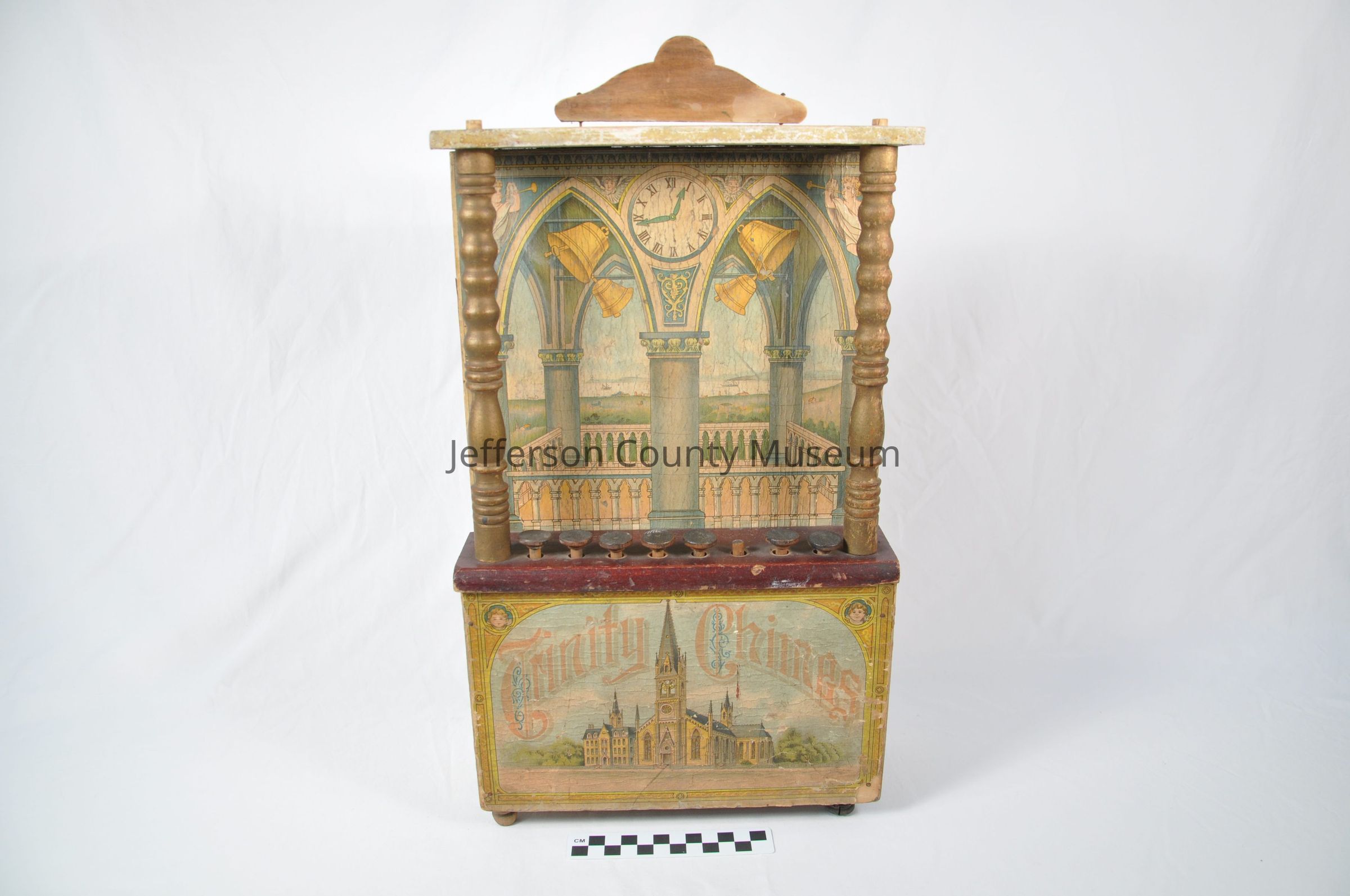 Trinity chimes resembles an organ in miniature. Wooden case with paper covering. Eight keys producing sound similar to chimes. Picture of cathedral with three steeples at bottom over which is "TRINITY CHIMES".Acquisition