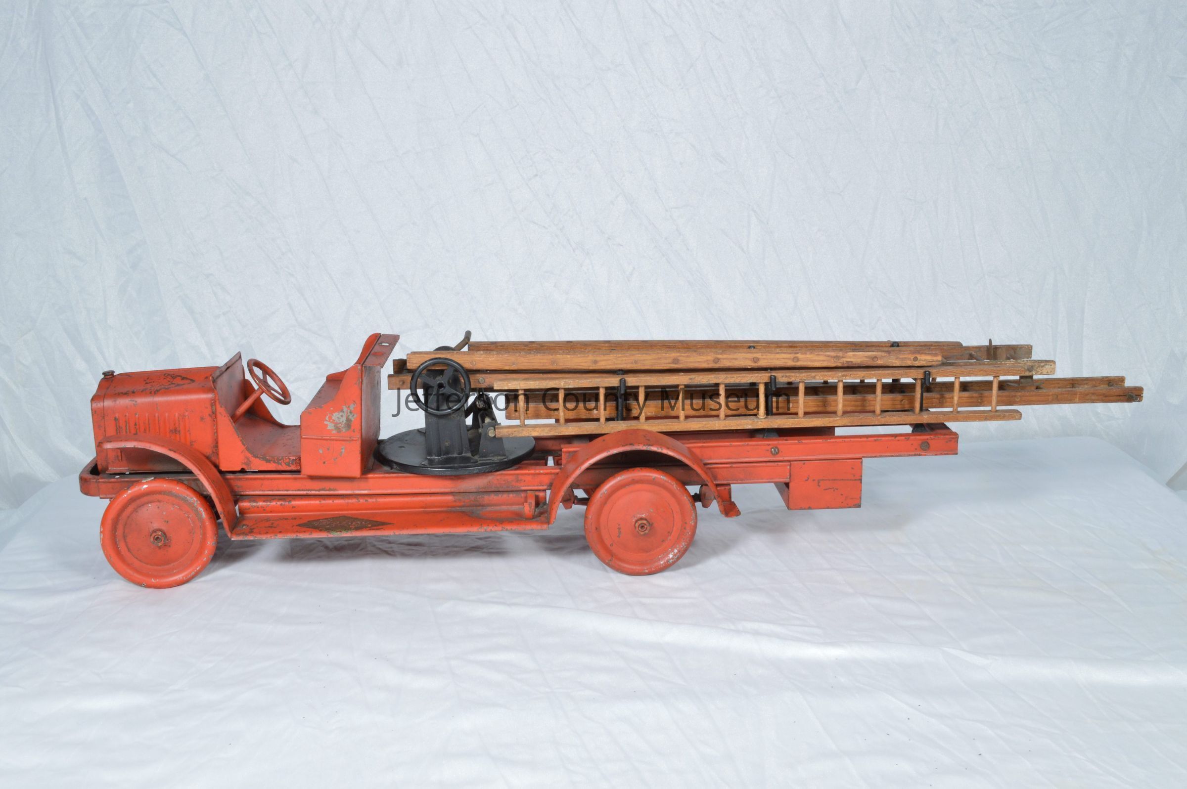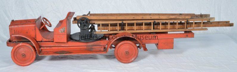 Wood and tin, red painted hook and ladder fire truck. Five wooden ladders. Tires are tin. Steering wheel turns front wheels. Has two cranks for elevating ladders. Marked "REG. U.S. PAT. OFF. Big Boy KELMET CORP. 200 FIFTH AVE. NEW YORK, N.Y."Acquisition