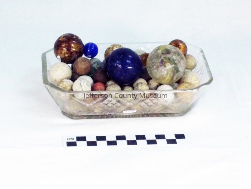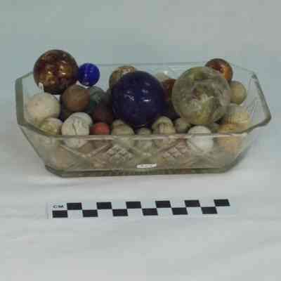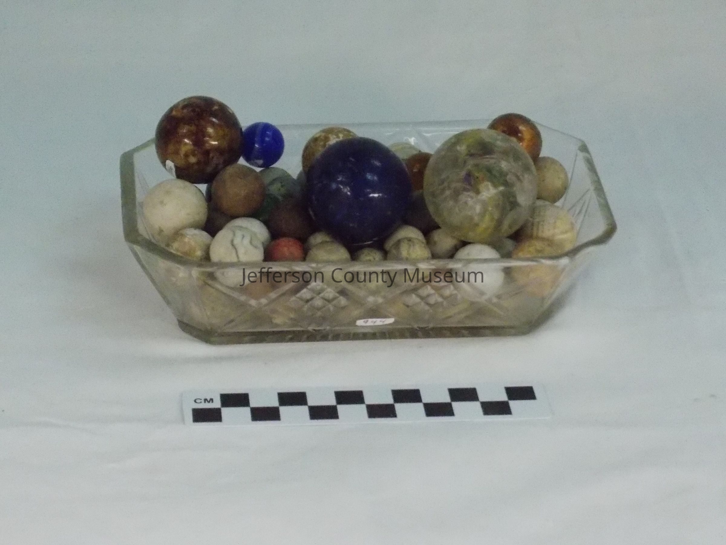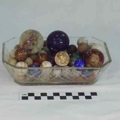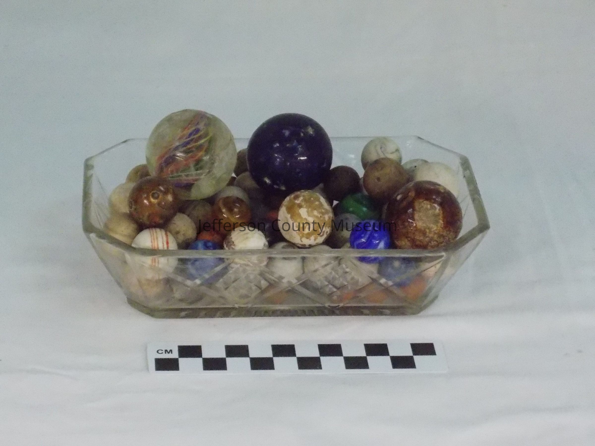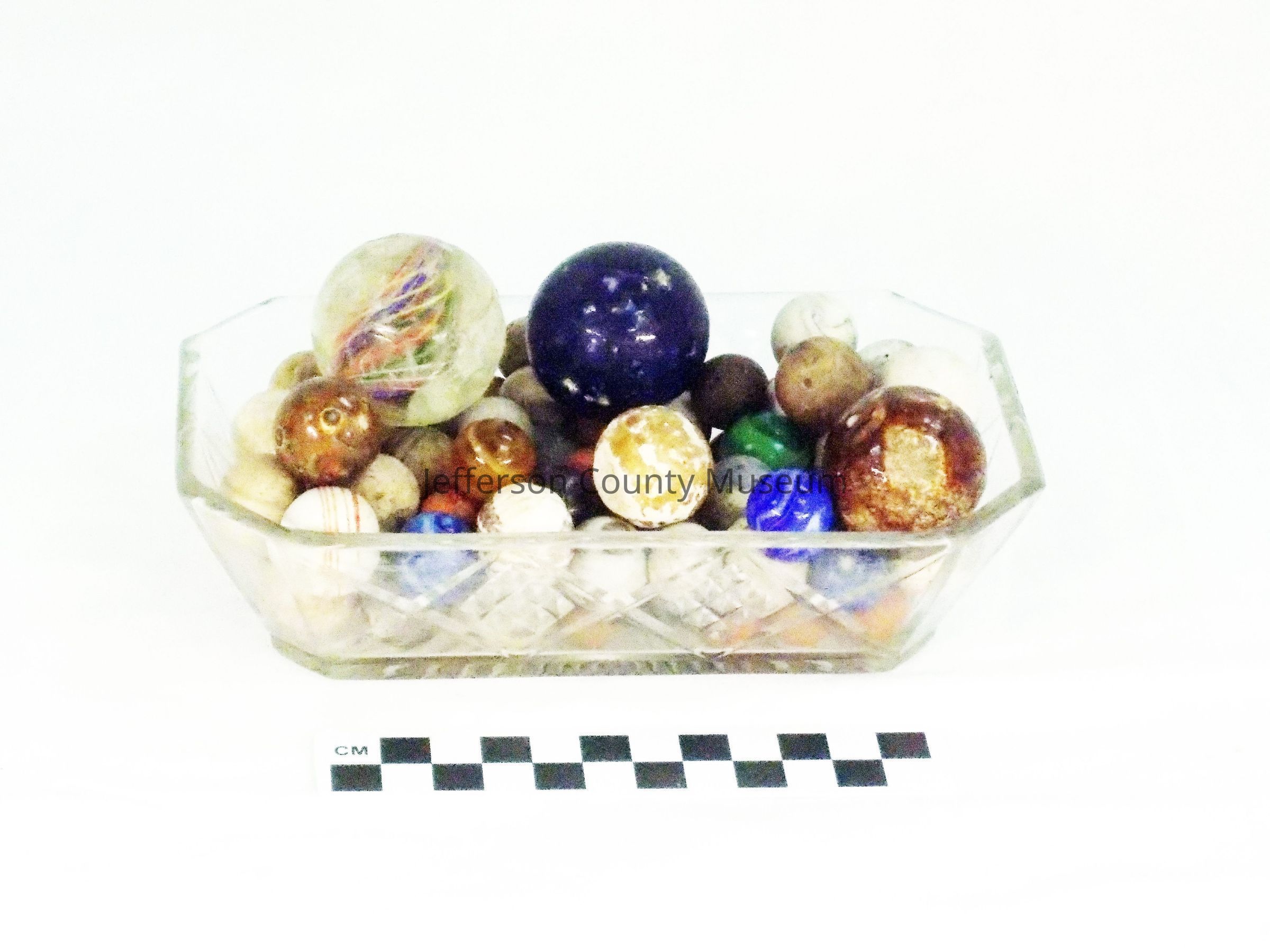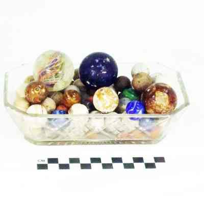 Collection of assorted marbles - 79 in all. Includes clay, aggies, swirled glass, one wooden.