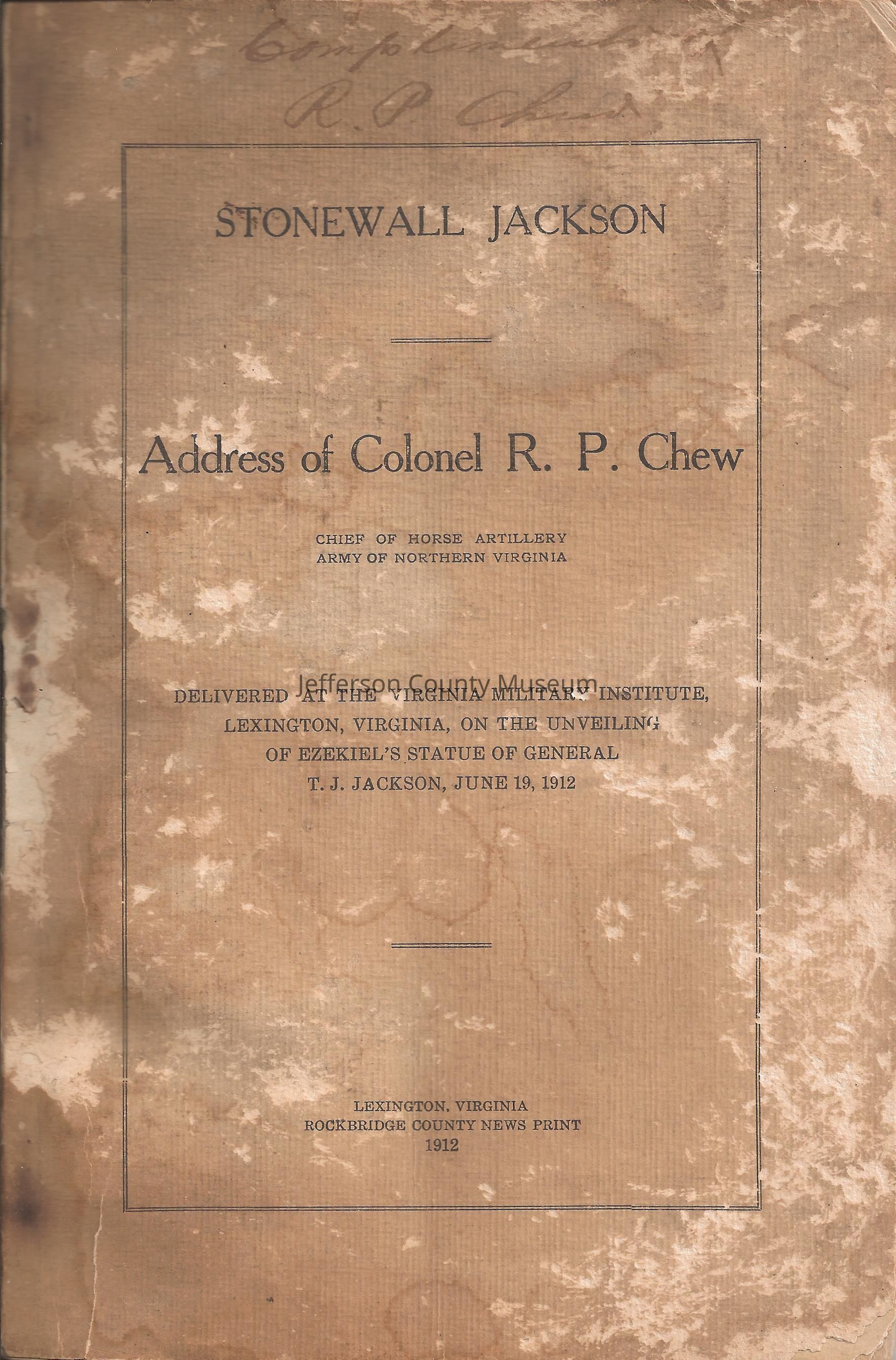 Stonewall Jackson: address of Colonel R. P. Chew, delivered at the Virginia Military Institute, Lexington, Virginia, on the unveiling of Ezekiel's statue of General T. J. Jackson, June 19, 1912Entry/Object ID