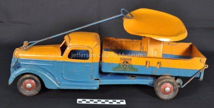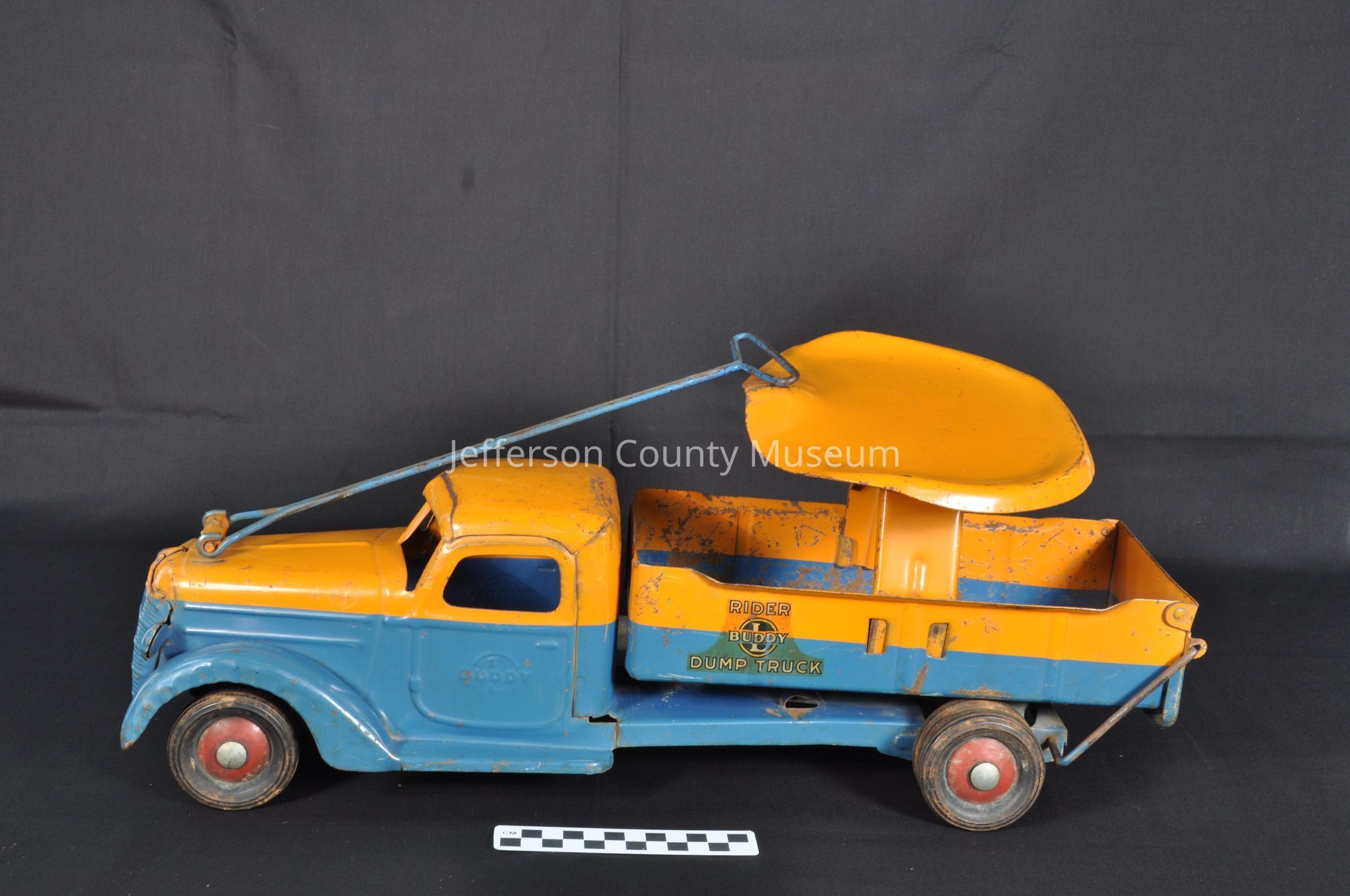 Dark yellow and blue dump truck with seat. Dual wheels in rear. Marked "RIDER BUDDY L DUMP TRUCK" on dump bed. "BUDDY L" in circle on both doors. Metal handle attached to hood for pulling.Acquisition