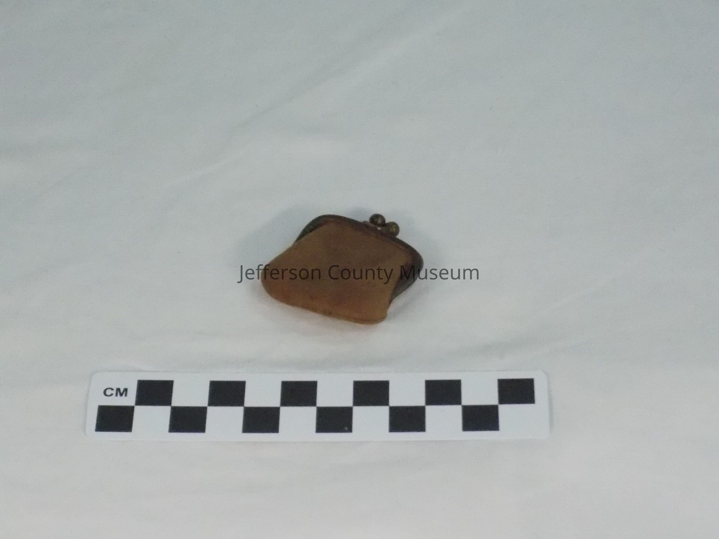 Doll's coin purse. Very small. Brown leather. Small blue beads inside.