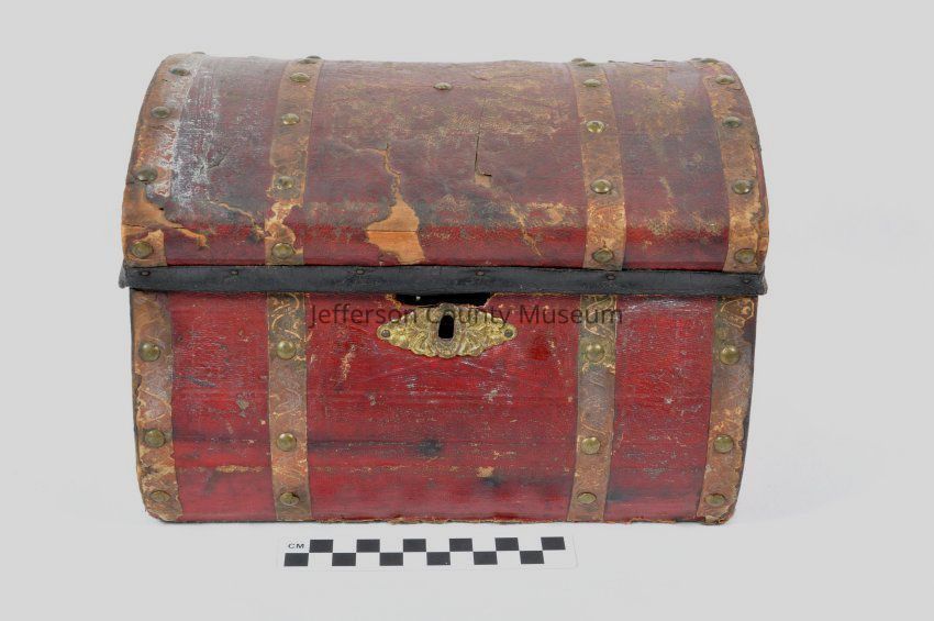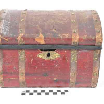 Wood trunk covered with thin red leather or Leatherette. Banded with yellow decoration with brass tacks on top, front and back. Brass keyhole cover.Acquisition