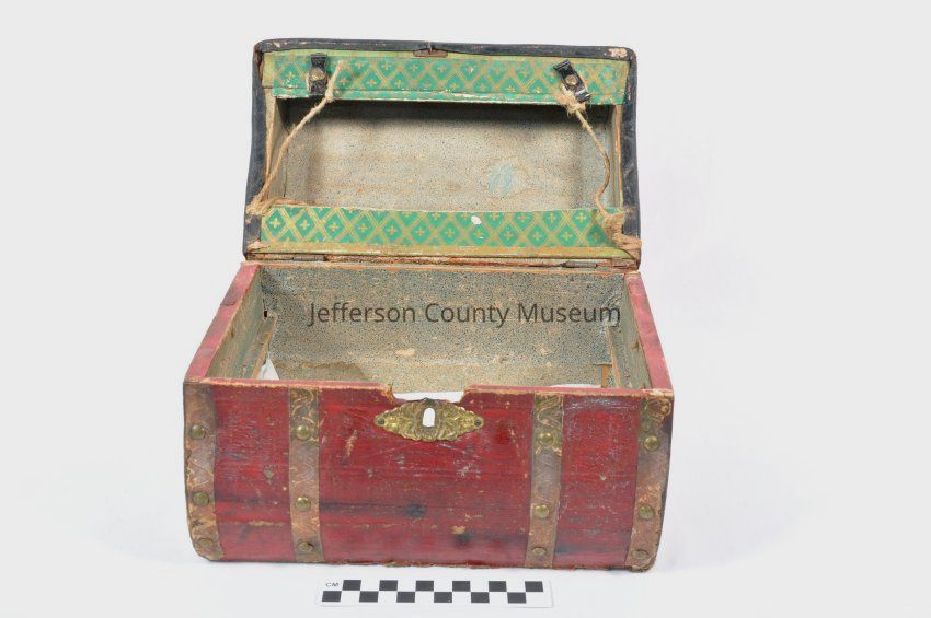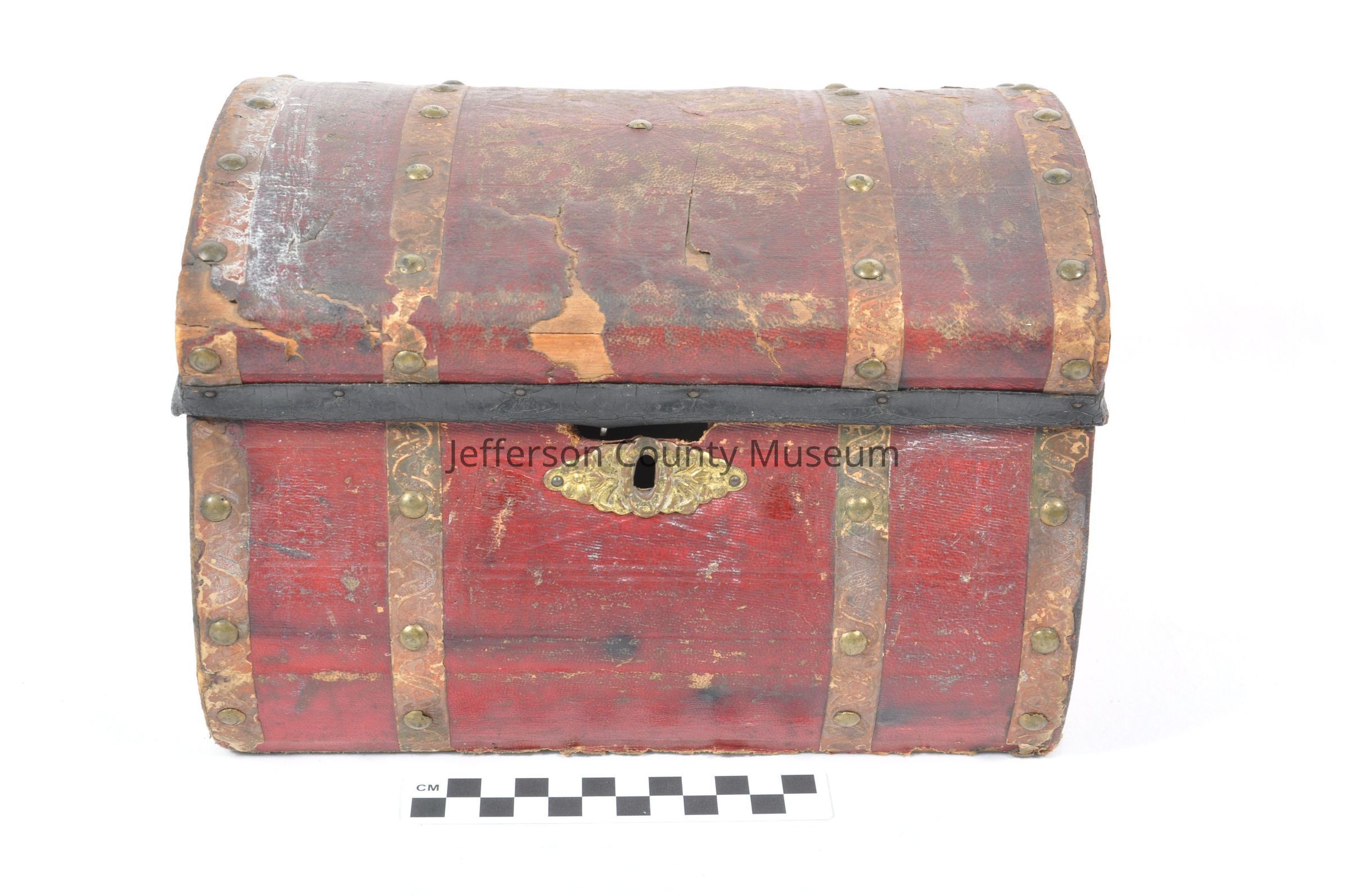 Wood trunk covered with thin red leather or LeatheretteEntry/Object ID