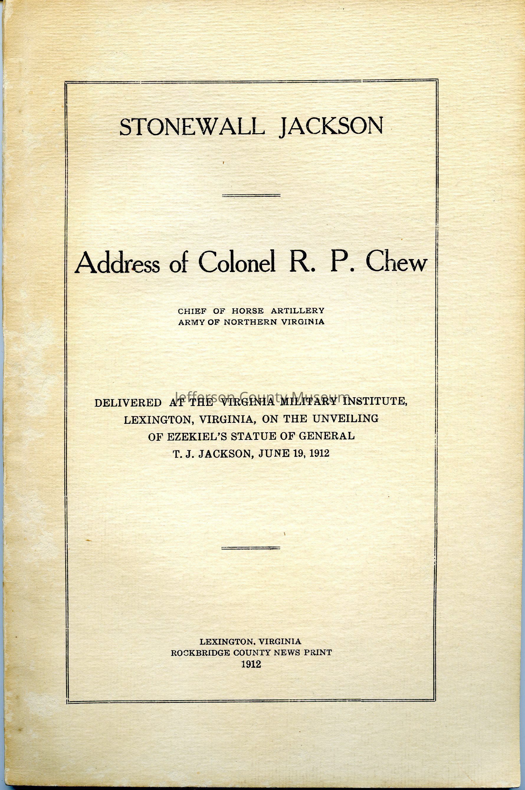 Stonewall Jackson: address of Colonel R. P. Chew, delivered at the Virginia Military Institute, Lexington, Virginia, on the unveiling of Ezekiel's statue of General T. J. Jackson, June 19, 1912Entry/Object ID