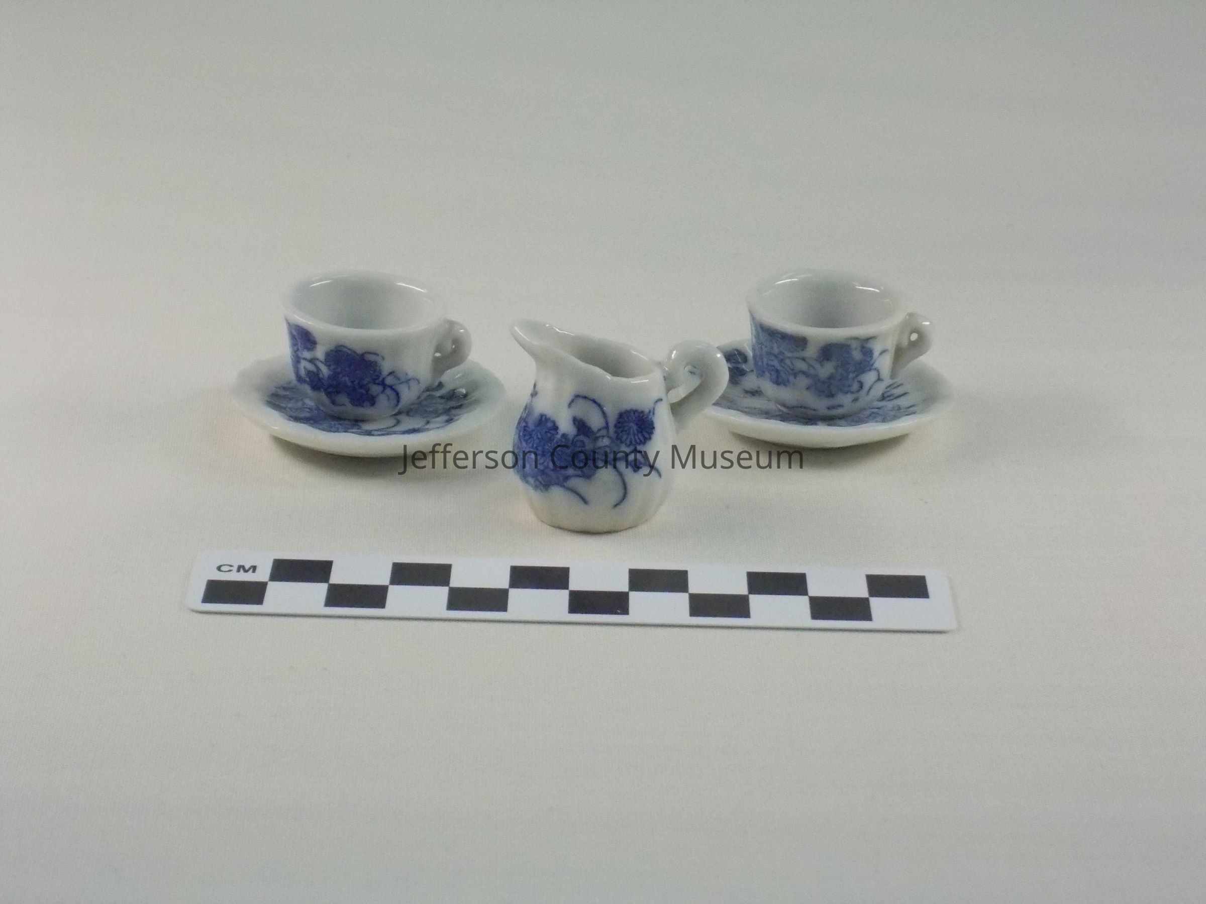 Doll dishes: includes two blue and white china cups and saucers, and one blue and white china pitcher.