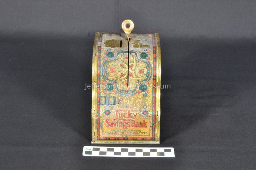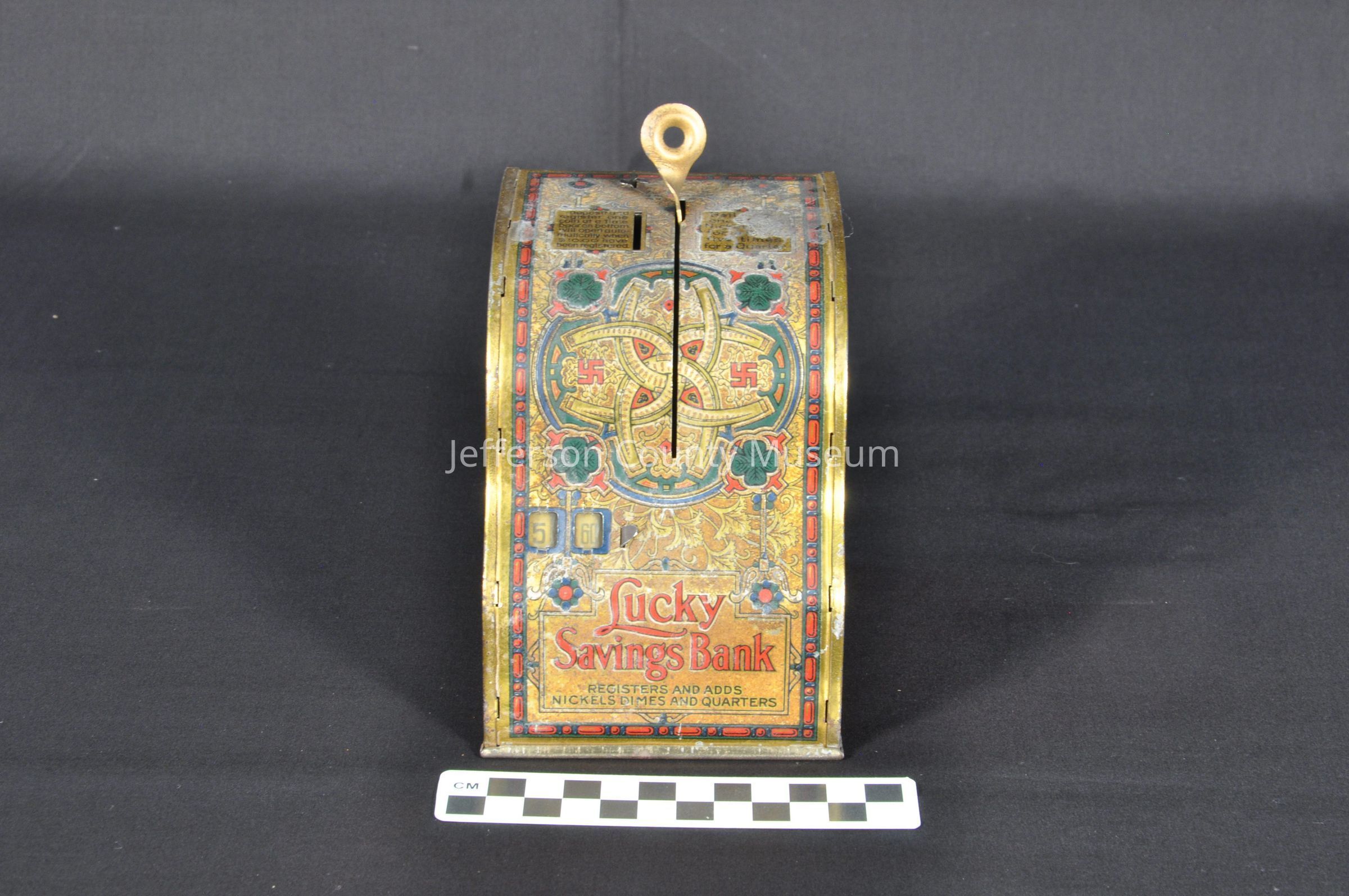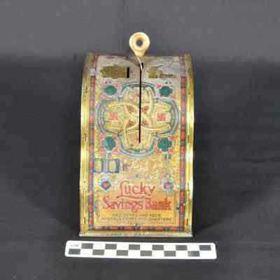 Polychromed tin cash register bank. On front at bottom "Lucky Savings Bank REGISTERS AND ADDS NICKELS DIMES AND QUARTERS pat. 1913 & 1916 ". Directions on how to operate bank on back. At bottom of directions "MANUFACTURED BY SHONK WORKS - AMERICAN CAN CO. MAYWOOD, ILL. Patented Nov. 11, 1913 and June 13, 1916.Acquisition