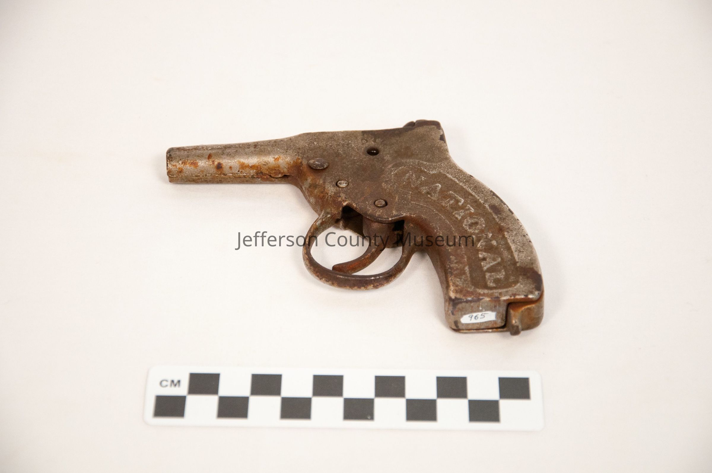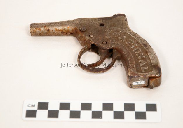 Cap pistol. Heavy metal. Marked "NATIONAL" on both sides of grip.
