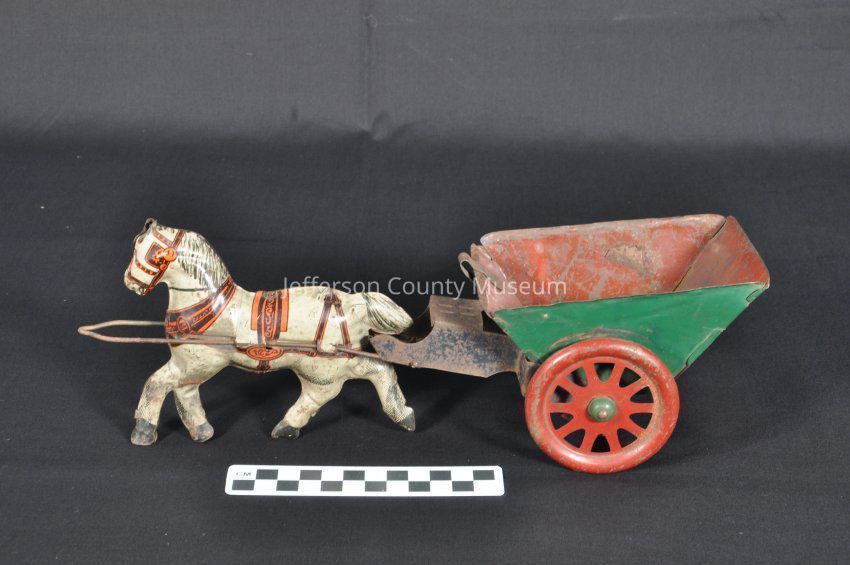 Tin horse with cart. Horse is molded of metal in two parts and painted with some detail. Cart is painted red and green. Wheels are painted red.Acquisition