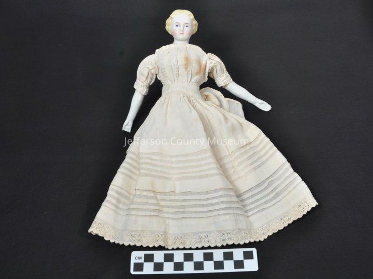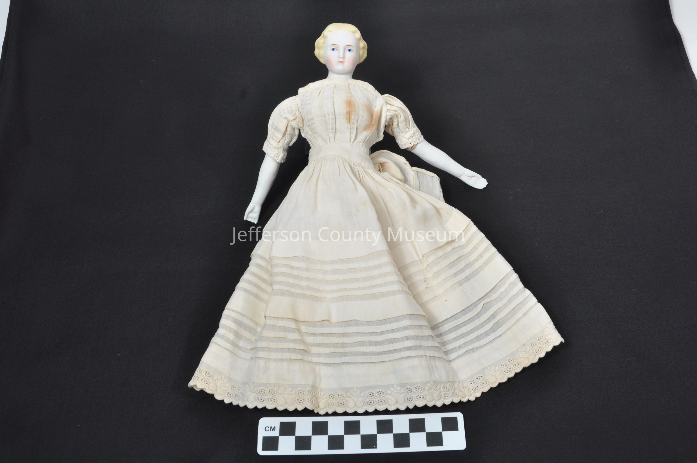Female doll, blond with blue eyes and ceramic head, lower arms and lower legs. Cloth body. Wearing white dress, petticoat and pantalettes.Acquisition