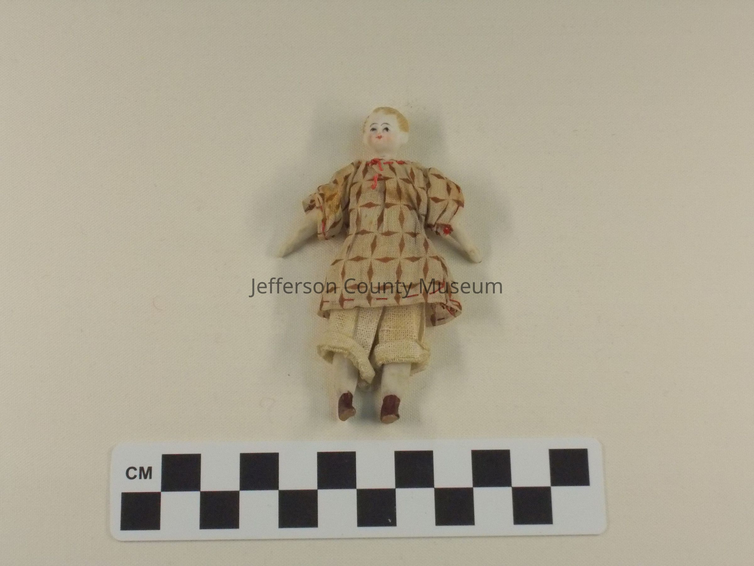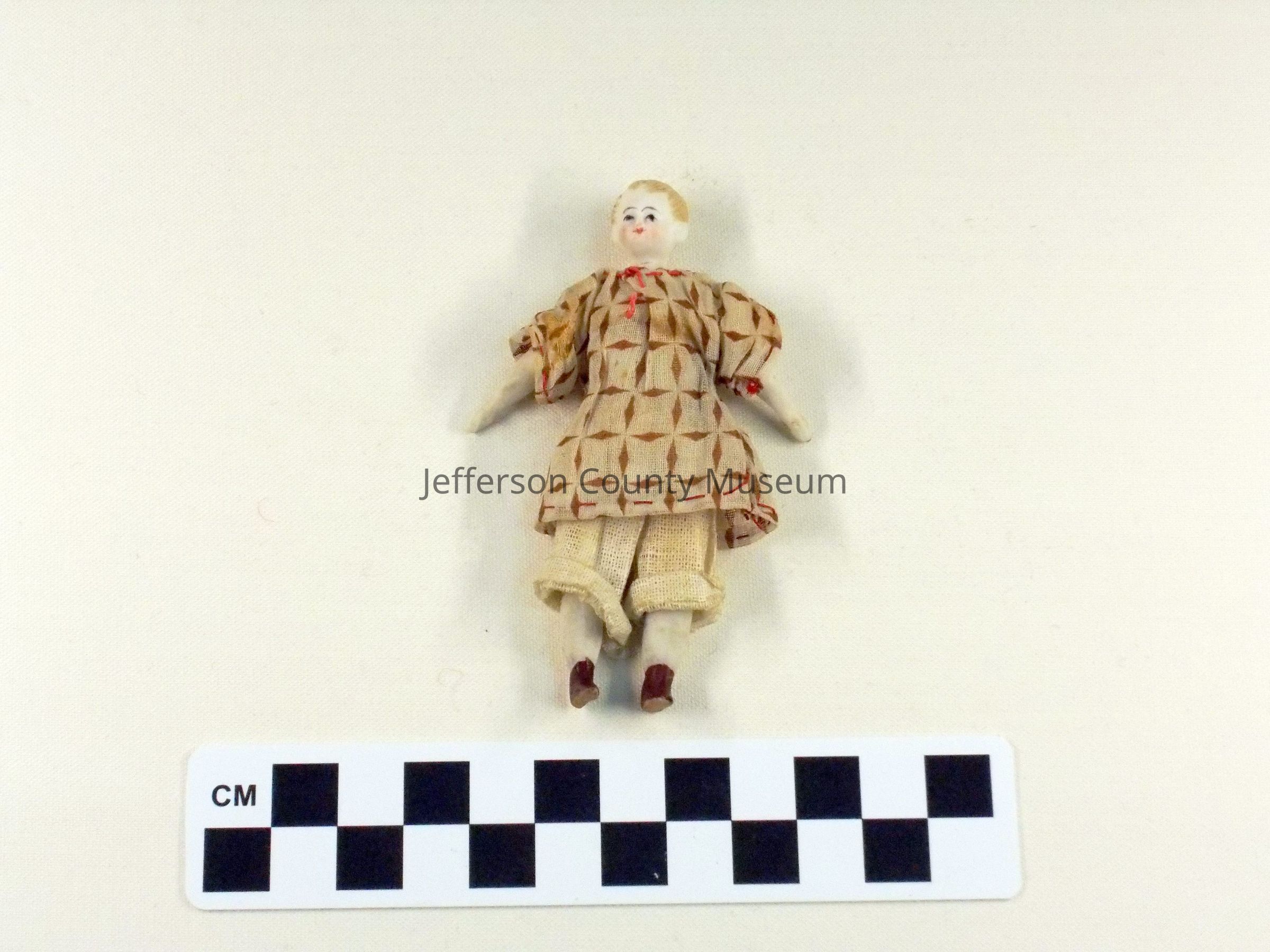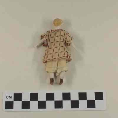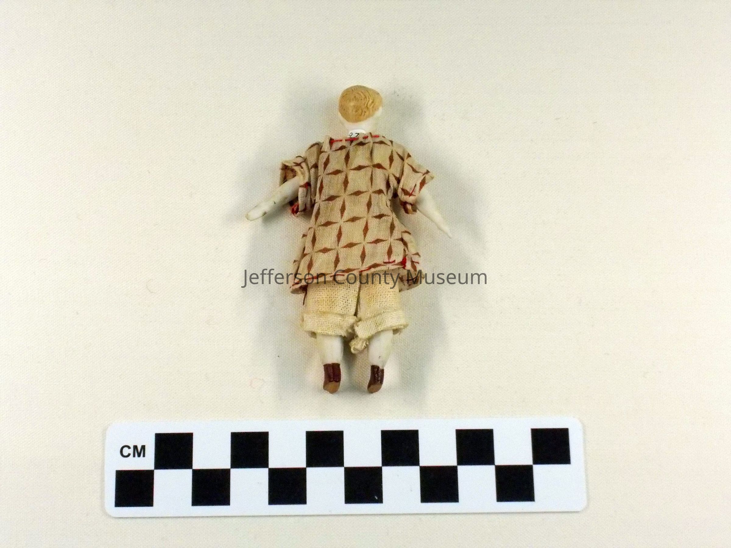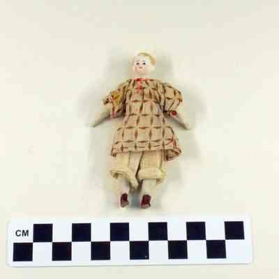 China male doll with ceramic head, lower arms, and lower legs. Head with blond hair and blue eyes. Cloth body wearing coarse print tunic and white trousers.Acquisition