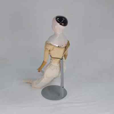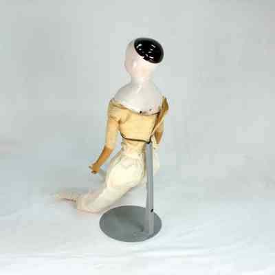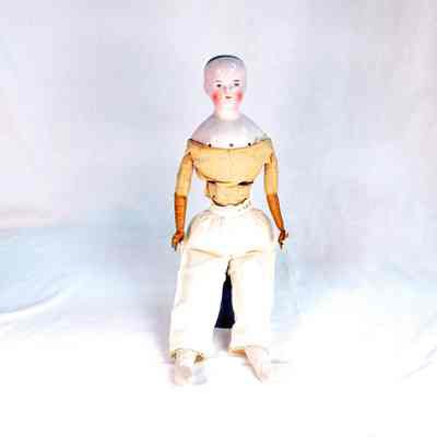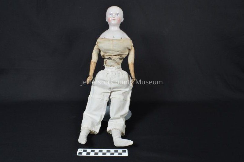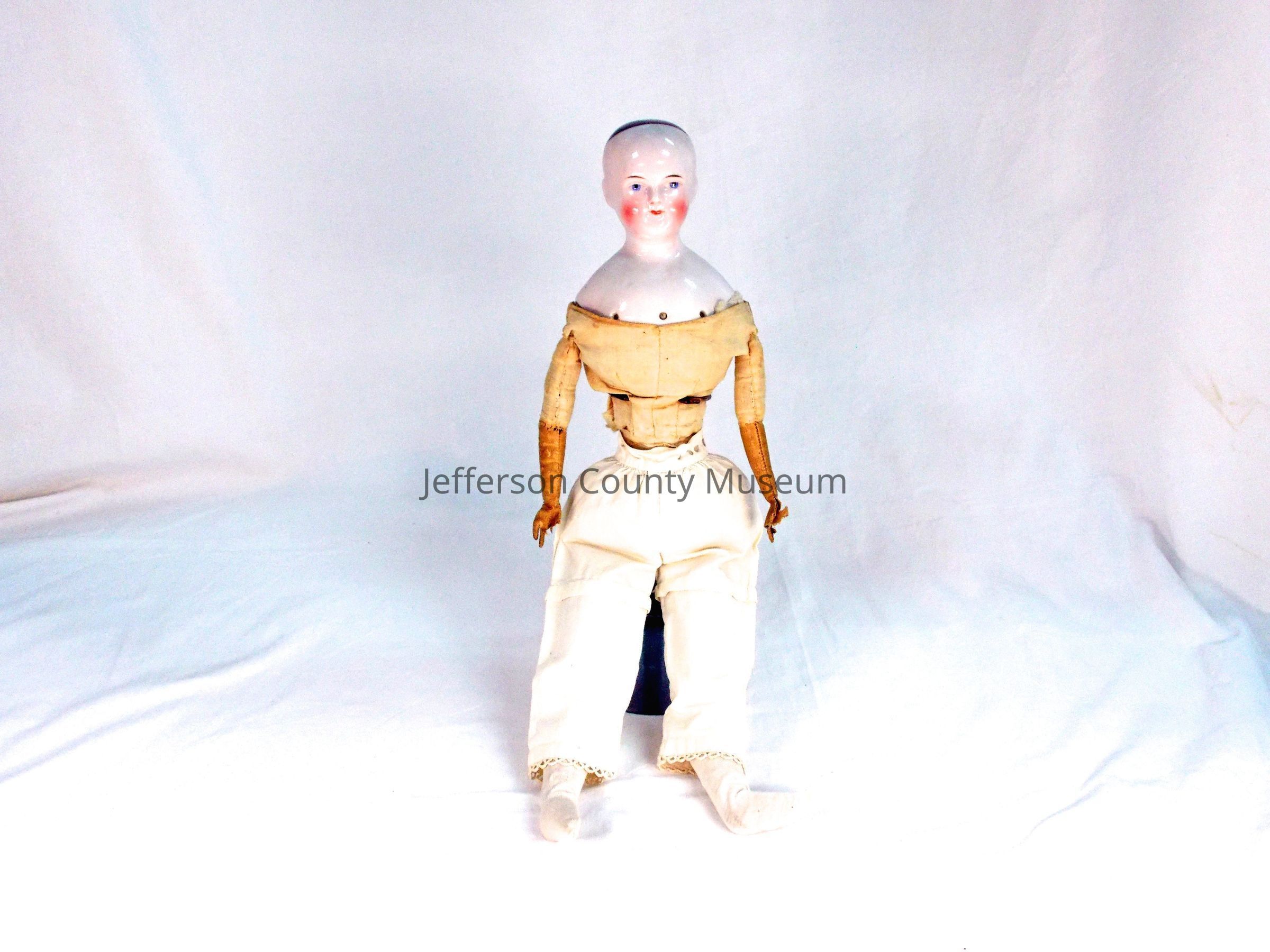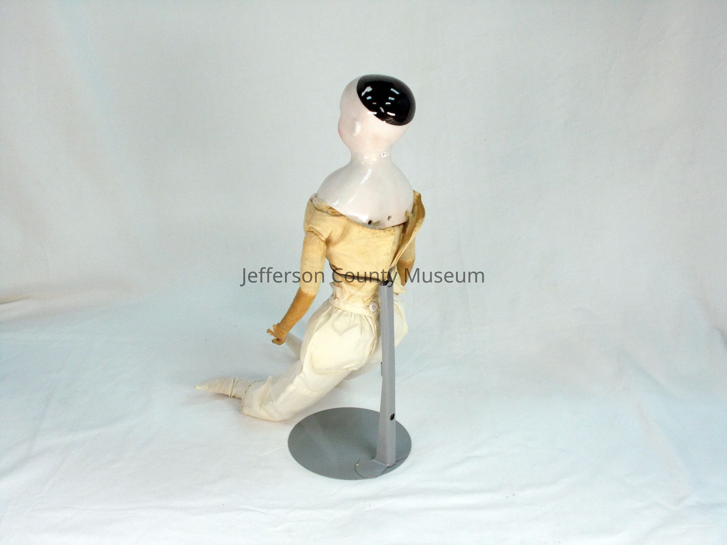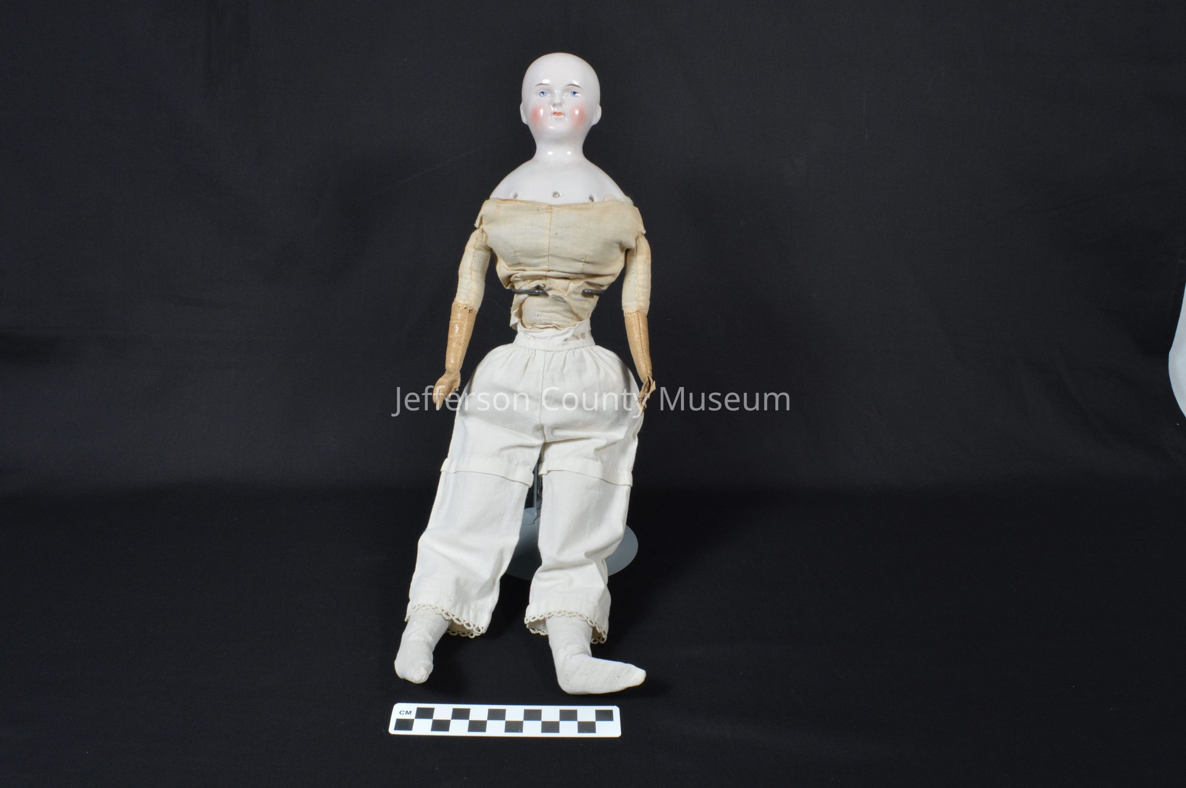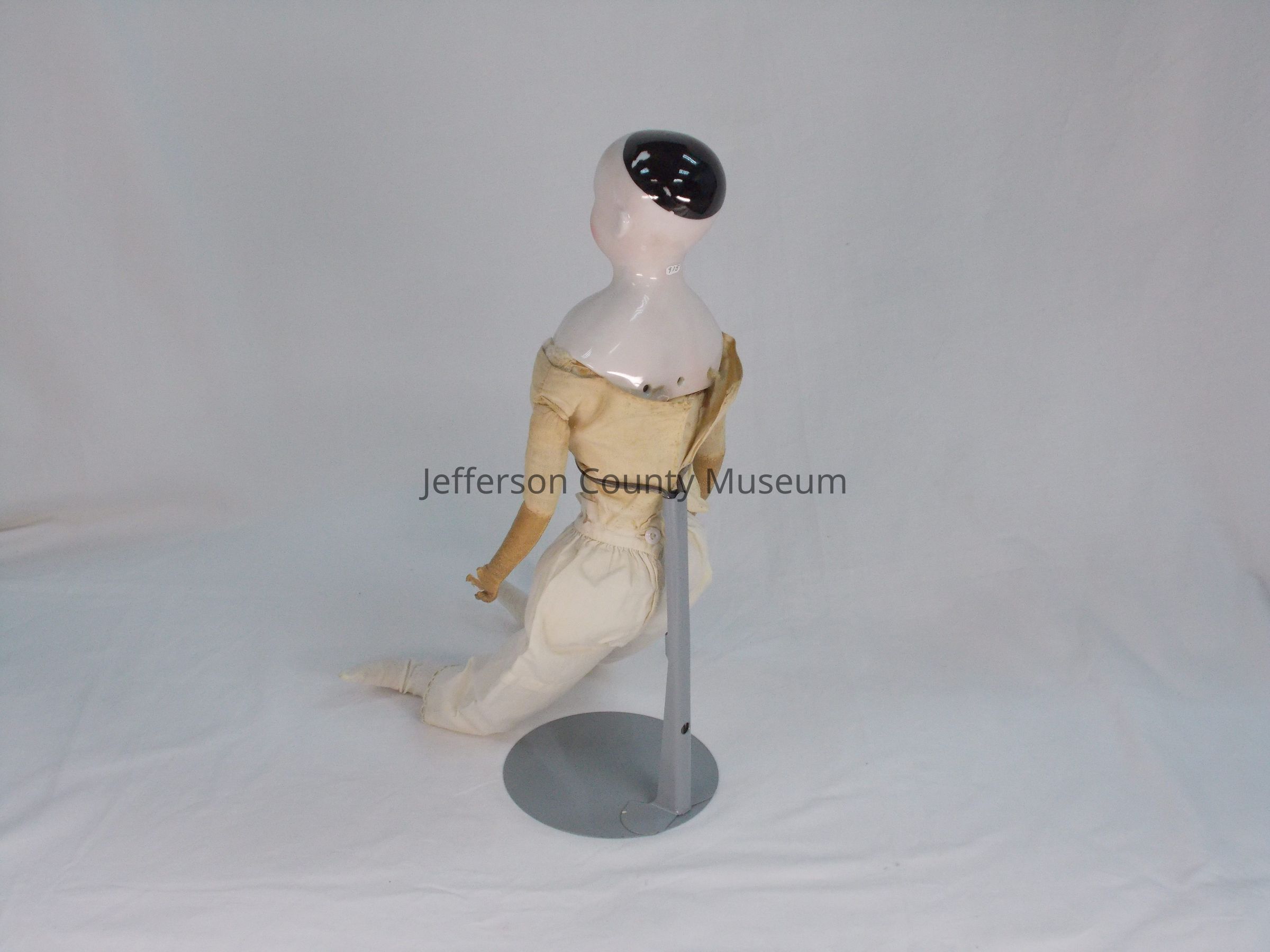 Female doll with china head, blue eyes, and painted black skull cap where hair would be. Cloth body with leather arms from elbows to hands and white pantaloons. Belonged to Miss Elizabeth Travers.Acquisition