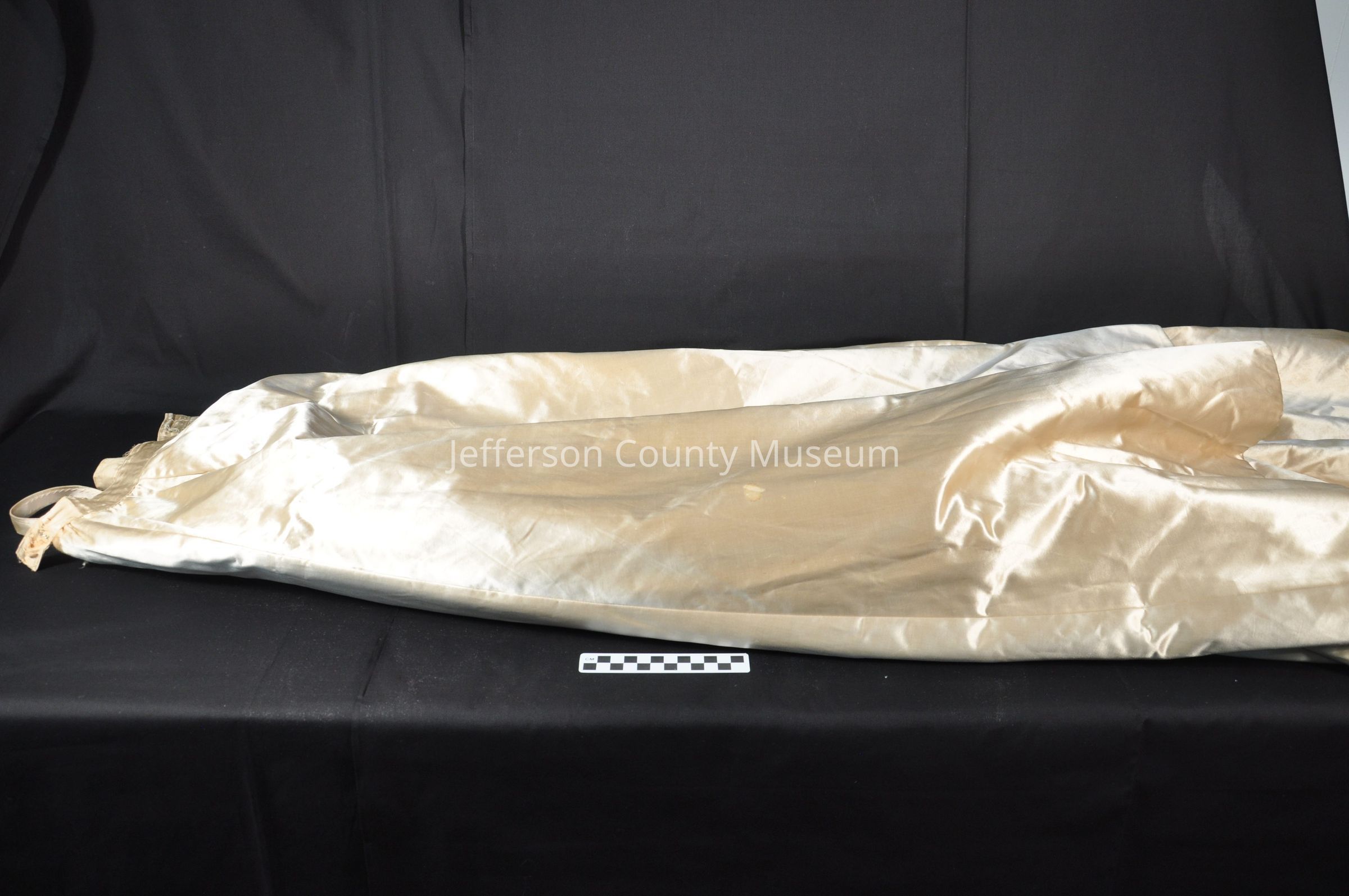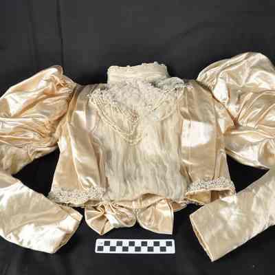 Two piece silk/satin wedding dress. Cream colored and lined throughout. Original color was white. Chiffon down front of bodice. High collar embroidered with artificial pearls across front and sewn around waist. Full length skirt with train. Long "leg-o' mutton" sleeves. Worn by Laura Kennedy at her wedding to Joseph Trapnell, Jr., in 1895 at Zion Episcopal Church.Acquisition