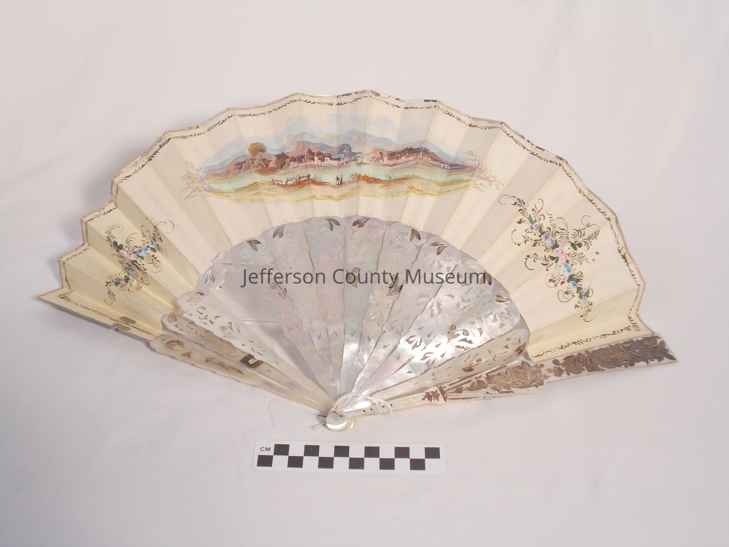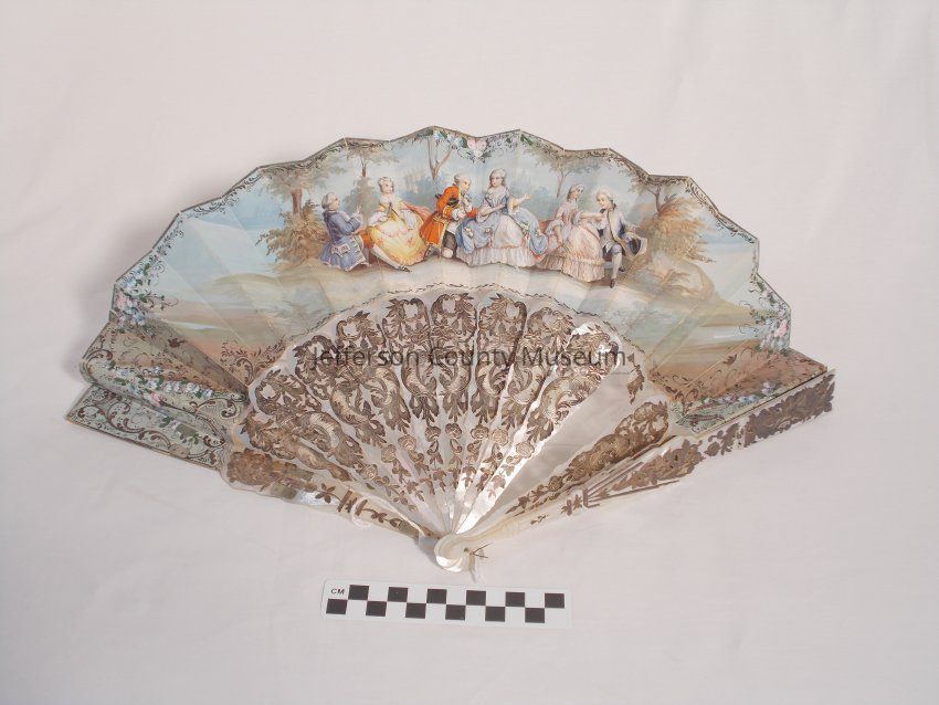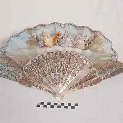 Mid-19th century painted paper fan with mother-of-pearl and silver sticks. Front painted scene shows three women and three men in 18th century court clothing. Back painted scene shows a country town with hills in background and two people in country-style clothing in foreground.Acquisition