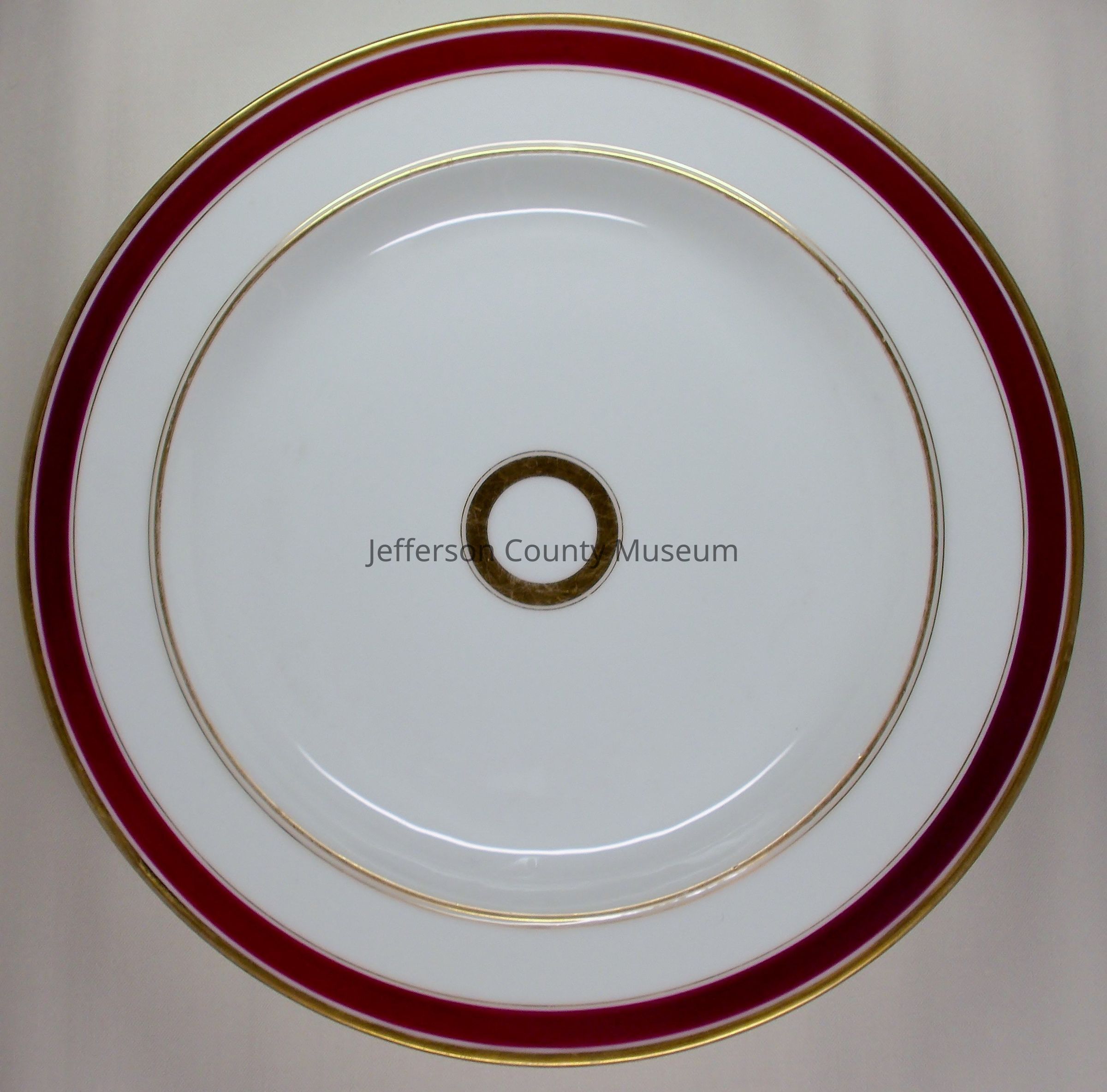 White soup bowl with maroon band and gold leaf around rim. In center is ring of gold leaf.