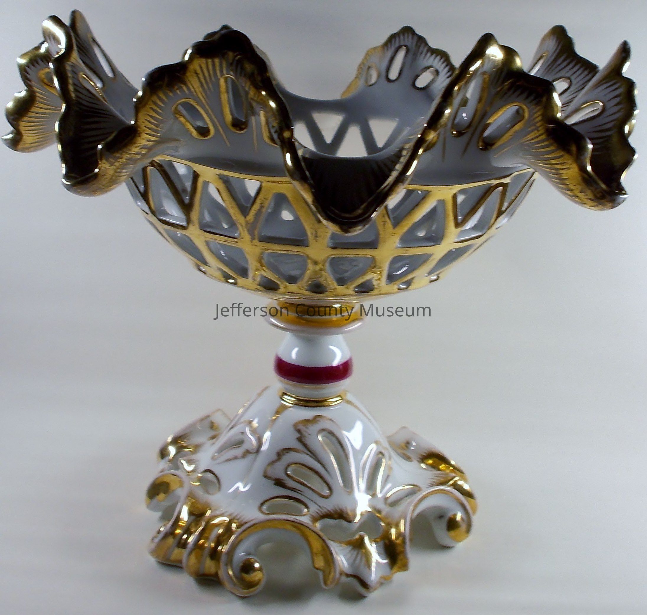 Bowl on pedestal. Bowl is bolted onto stand. Base and bowl are openwork china. Bowl has lattice running around the entire circumference. The outside is gilded. Lip of bowl is fluted sharply with more openwork in it. The stem of the stand has one maroon band. The rest of the china surface is white or gold leaf.Acquisition