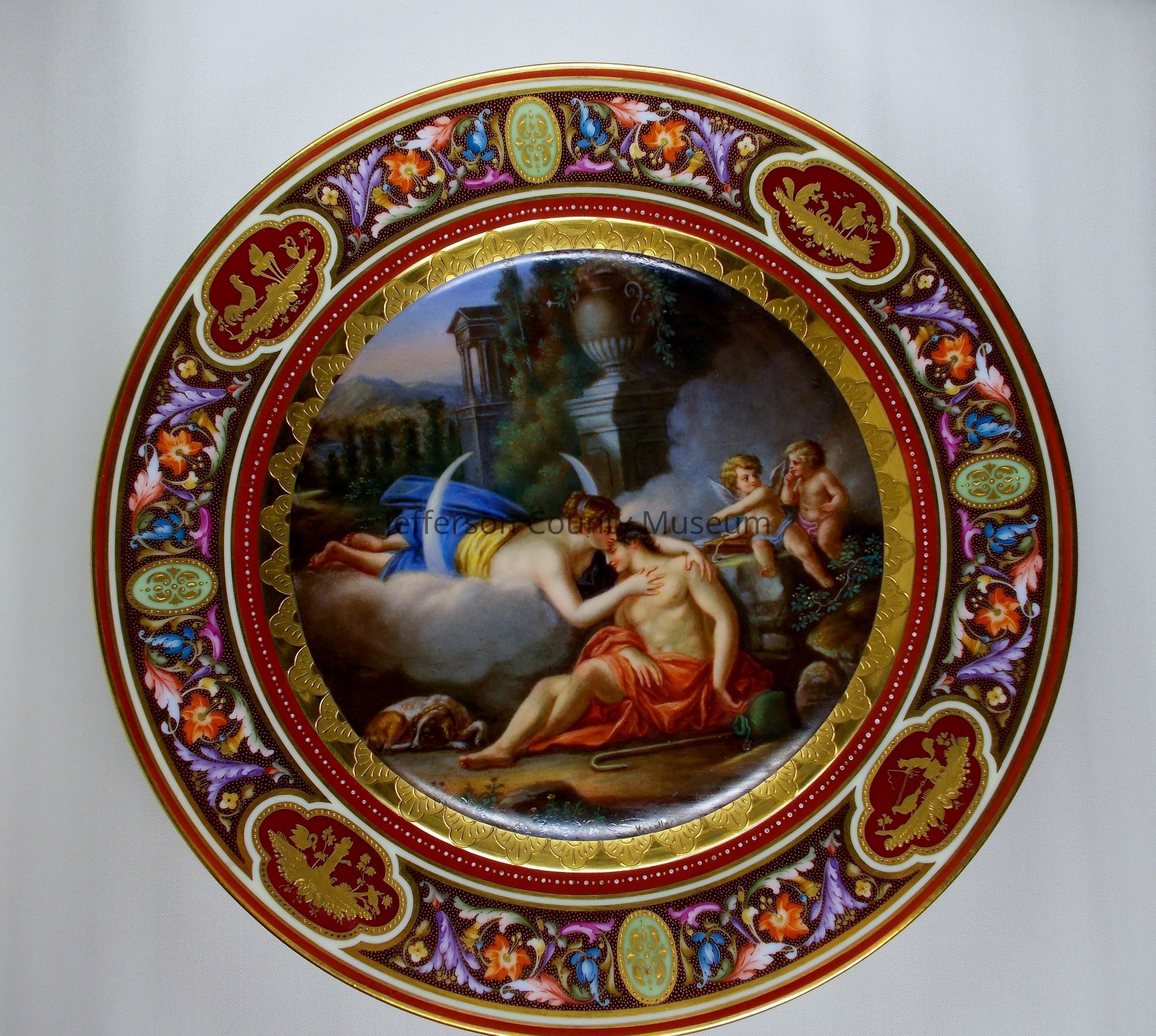 Enamelled plate with designs around rim in raised gold and various colored acanthus leaves. Scene is Luna with Endymeon banded with a raised design in gold and a band of red with raised white dots. Back of plate has Luna w. Endymeon and a blue mark similar to a large D with two vertical stripes.Acquisition
