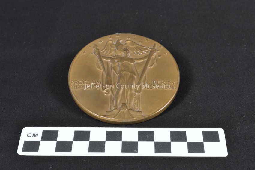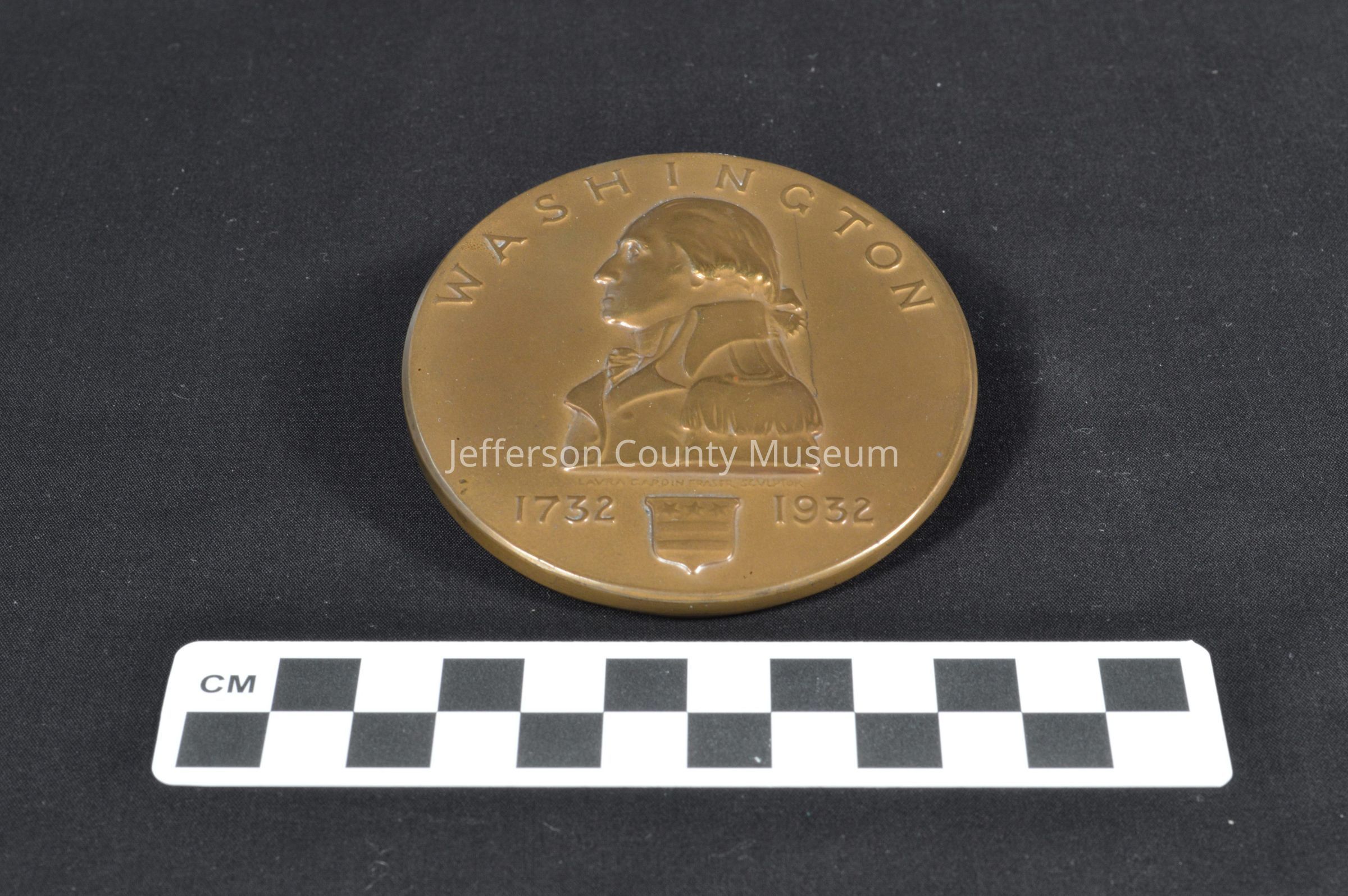 Bronze George Washington memorial medal. Reverse has left profile of George Washington with "WASHINGTON" around top. Dates of "1732 1932" with G.W. coat of arms between. Under image of G.W. in very fine print "LAVRA CARDIN FRASER SCULPTOR". Obverse has Liberty standing with sword in left hand and torch in right. Spreadwinged eagle is perched on Liberty's right shoulder. Thirteen stars are around top. Printed beside Liberty "PROCLAIM LIBERTY THROUGHOUT ALL THE LAND".Acquisition