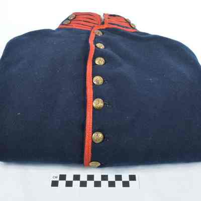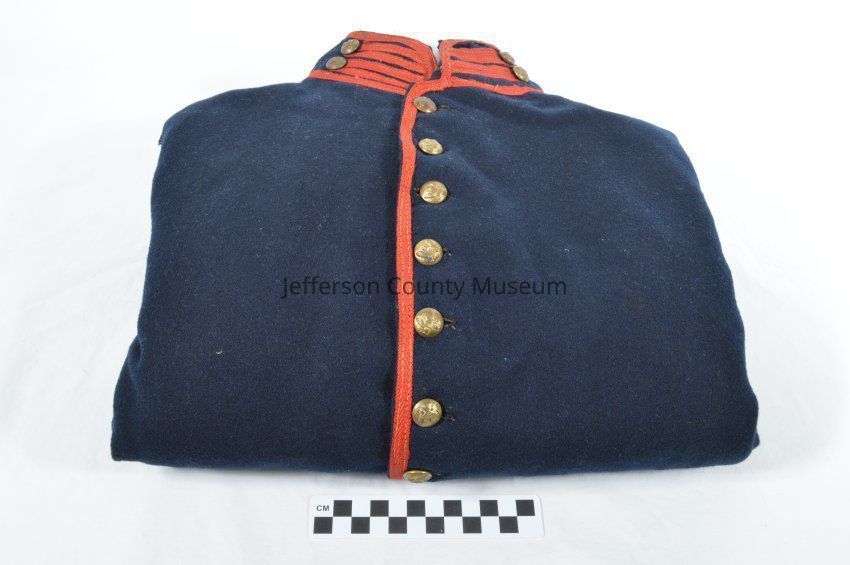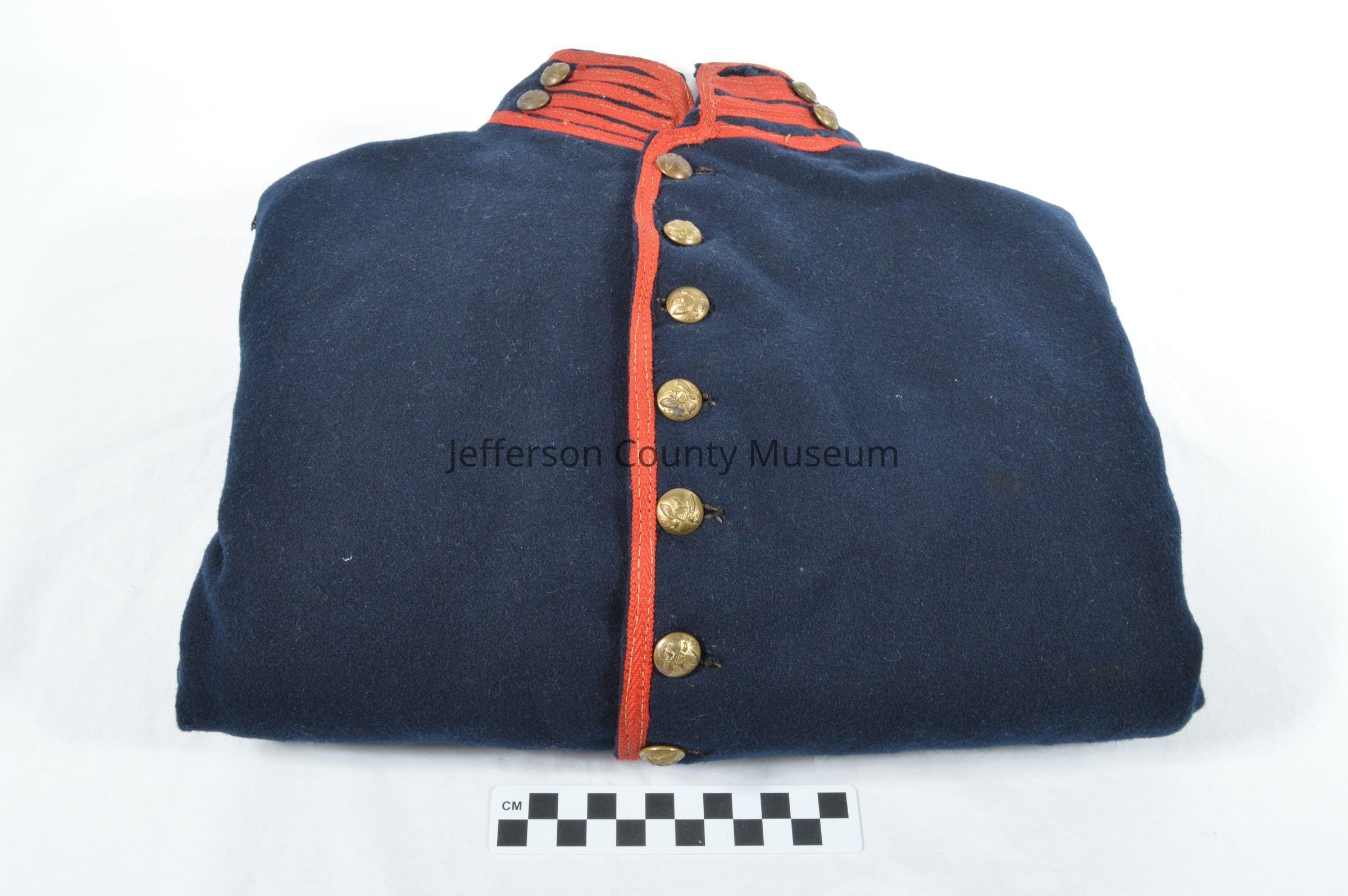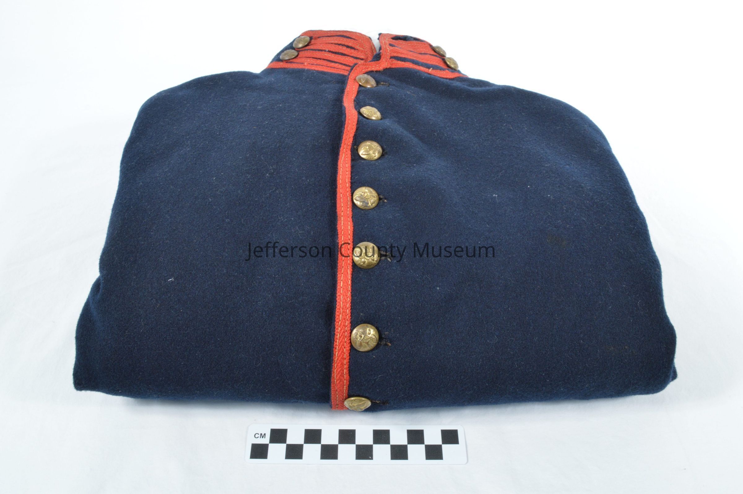 Dark blue wool U.S. artillery shell jacket with red stripes on collar and one vertically down front. Brass buttons with U.S. spread-winged eagle.Acquisition